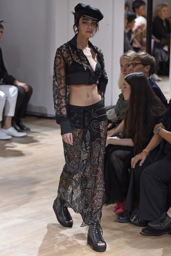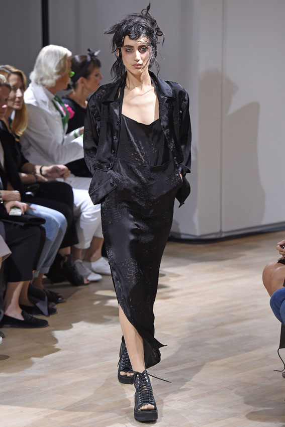 Il mondo di Yamamoto risulta grazioso e sensuale, i tagli degli abiti hanno forme comode, ma non risultano affatto innocenti, anzi rimandano una forte aggressività. Scivolano uno dopo l’altro, sulla passerella parigina, abiti in seta che accarezza gli esili copri delle modelle sulle note di un tango, mentre, lascive, le spalline cadono dalle spalle. Giacche che sembrano vestaglie con lacci da corsetto slacciate e trasparenze mai troppo accennate, giacche corte in jeans su corpi semivestiti, intrecci di tessuti e fili, cappotti asimmetrici e trasversali, gonne lunghe e morbide in contrasto con giacche cortissime e squadrate. A fare contrasto con il bianco e nero, che sono rimasti padroni della sfilata, un flash d’oro, così da tenere sempre il pubblico ipnotizzato.