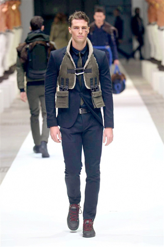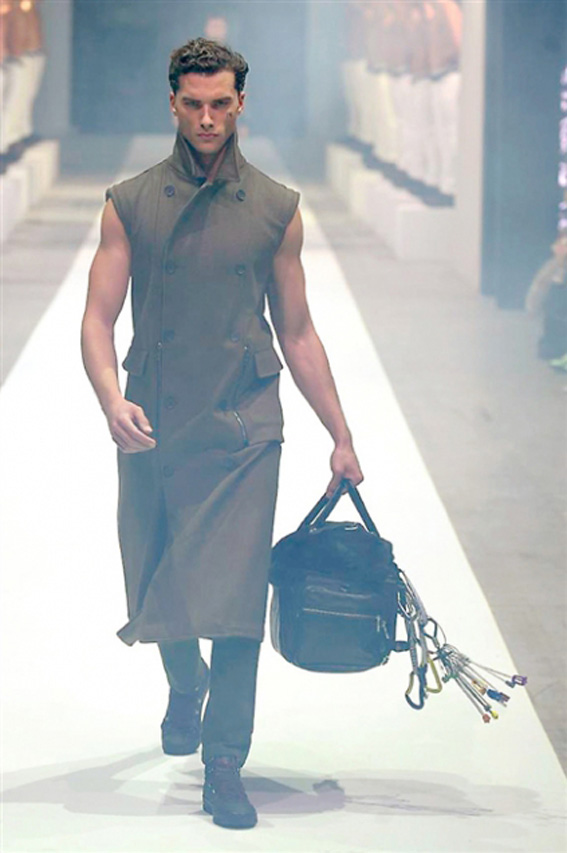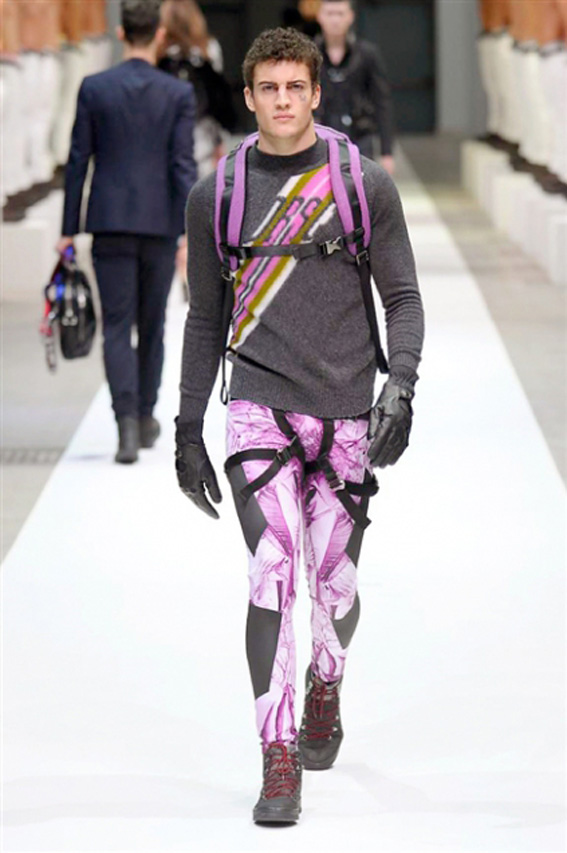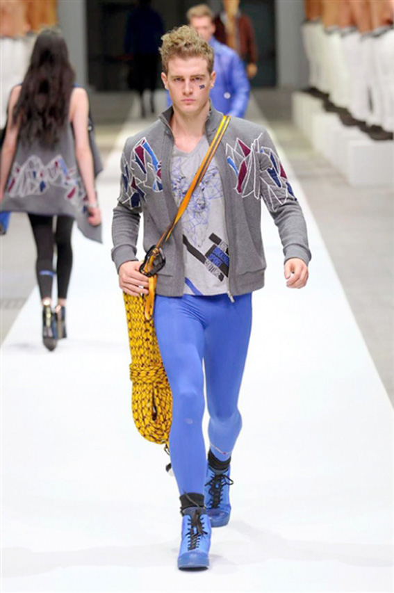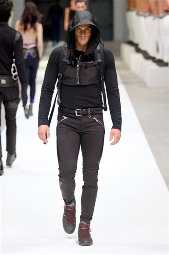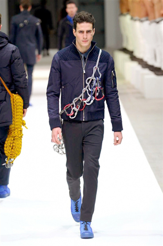 Moschettoni, imbracature, zaini e corde fanno da accessori chiave negli outfit della collezione, dagli abiti decisamente più sportivi, cappucci in tessuto tecnico, leggings (o meglio detti meggings), tute e piumini attillati, fino a essere parte integrante di completi giacca e cravatta.