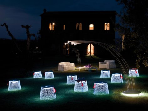 – Emu Ivy 595 oltre ad essere una pratica e leggera seduta, di sera si trasforma in una fonte di illuminazione grazie all’energia solare, per un tempo che va dalle 4 alle 6 ore (da stimare in base alla latitudine geografica e il periodo dell’anno). Accanto alla plafoniera si trova un pulsante che permette un’accensione automatica della luce appena si fa buio o, lasciando il pulsante spento, si può decidere se mantenere la lampada accesa o spenta. Completano la serie sedia e poltroncina in lamiera stirata a maglie larghe e tondino metallico, tavoli, divano, poltrona e tavolini in maglia metallica di lamiera stirata che crea un gioco di vuoti volumetrici.