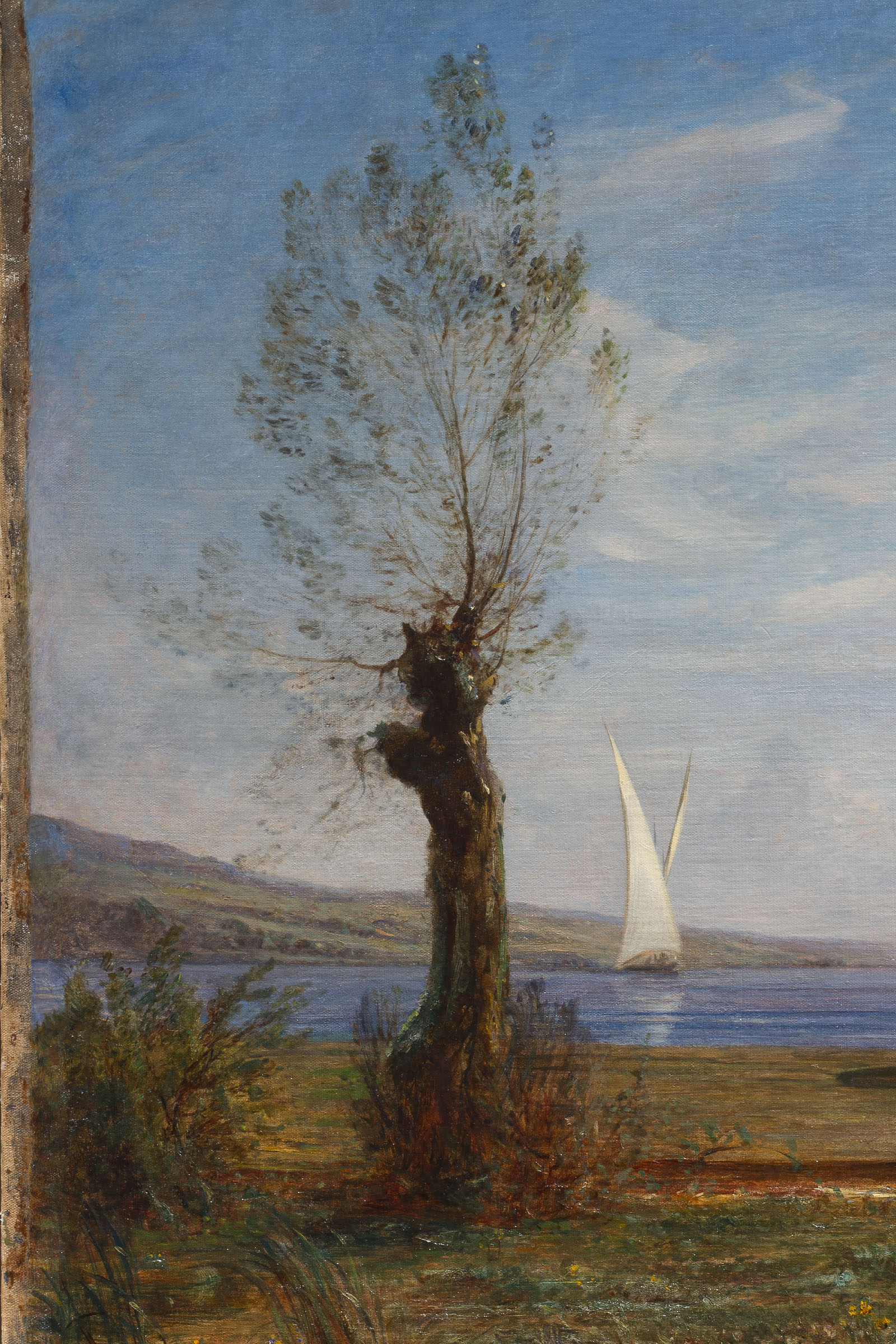 La grande tela sarà raccontata da Dragone che mostrerà ai visitatori la ricchezza di questo capolavoro, dai colori intensi e insieme delicati, le pennellate materiche e di grande effetto, il vasto respiro della sua composizione basata su una rigorosa articolazione degli elementi nello spazio. Una tela che racconta una straordinaria “pagina” pittorica di quieta natura, intrisa di luce e piena di un tale panico sentimento del paesaggio, che pare tradurre persino una vivida percezione sensoriale del calore del sole e della vibrazione dell’aria, che si vedono nelle nubi che scorrono lievi nel grande cielo, gonfiare la vela sul lago mentre sembra far impercettibilmente muovere le fronde degli alberi, i cespugli e i fili d’erba dell’ampio prato in primo piano.