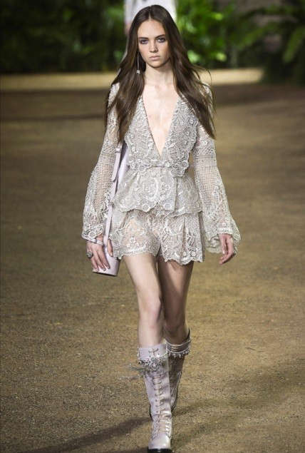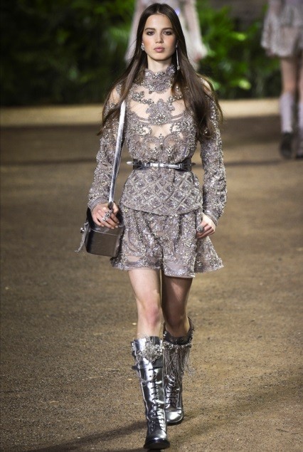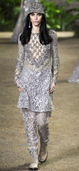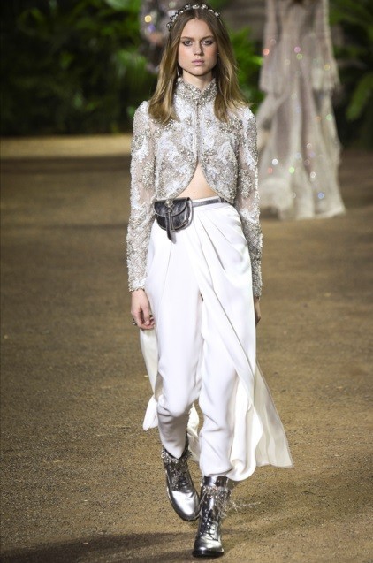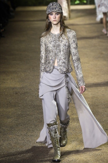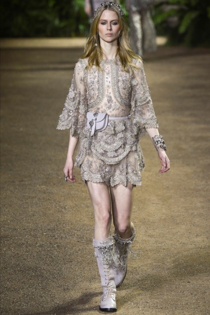Sete fluide, tulle ricamati di piccole perle, pizzi tridimensionali e broderie di fiori danzano per tutto lo spettacolo lasciando nell’aria un’atmosfera surreale che scivola passo dopo passo su anfibi da cui penzolano frange diamantate o sandali rasoterra illuminati di Swarovski.