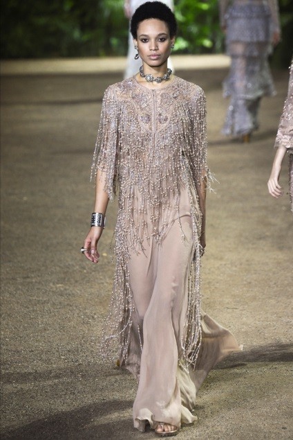 Le linee scivolate e impreziosite da applicazioni scintillanti, uno dei must have della Maison, capeggiano sui long dresses plissé che raccontano storie di giorni aristocratiche avventuriere british alla scoperta delle indie, avvolte in elegantissimi Sari dalle nuance delicate, rivisitati in maniera inedita e sorprendente.
