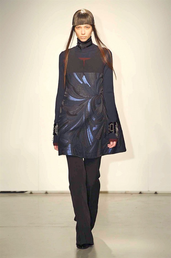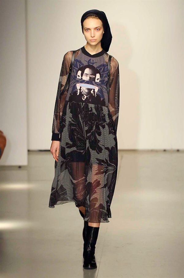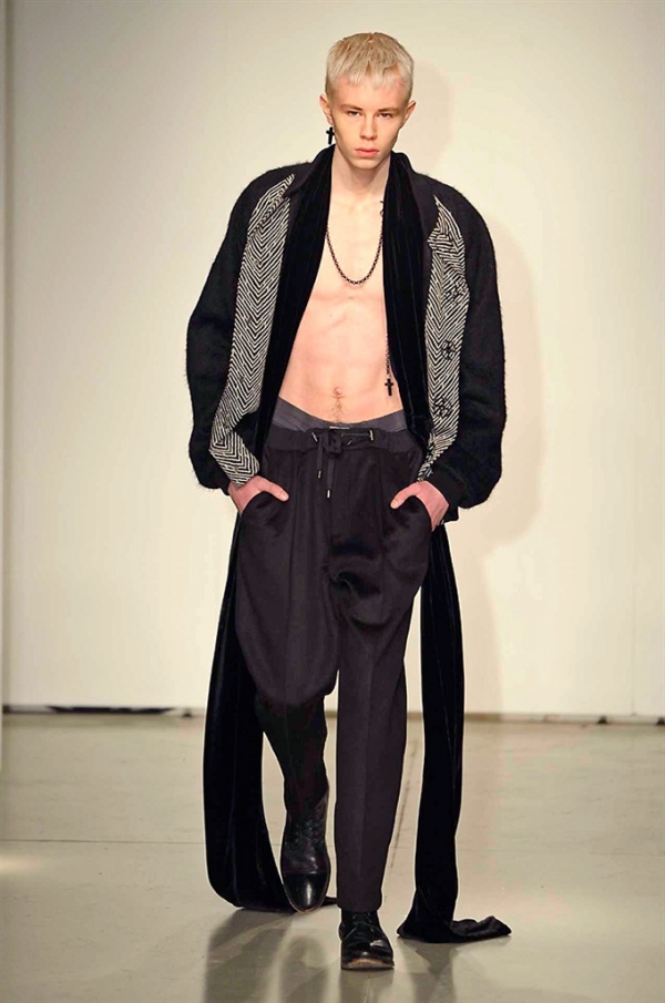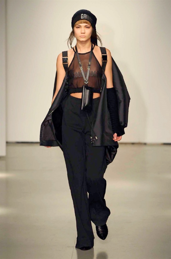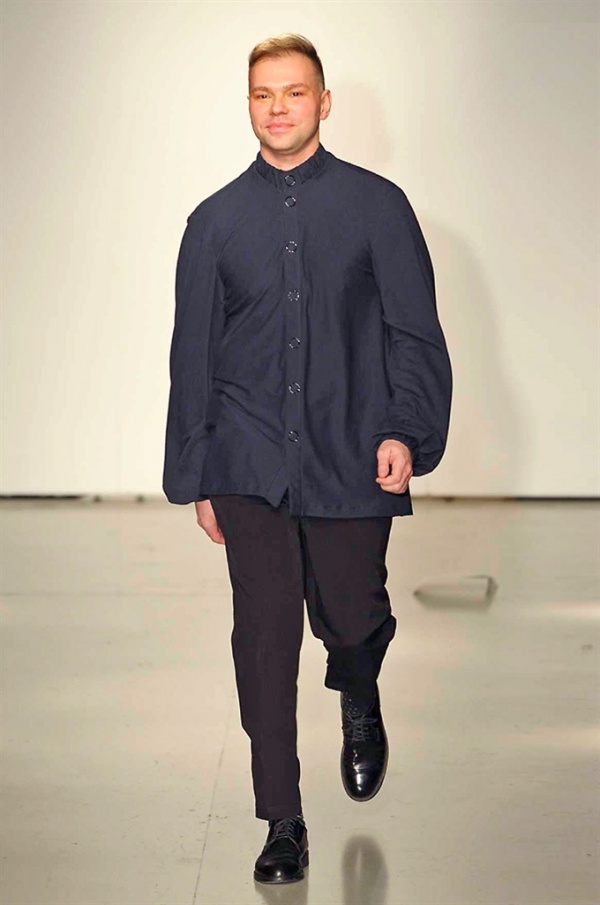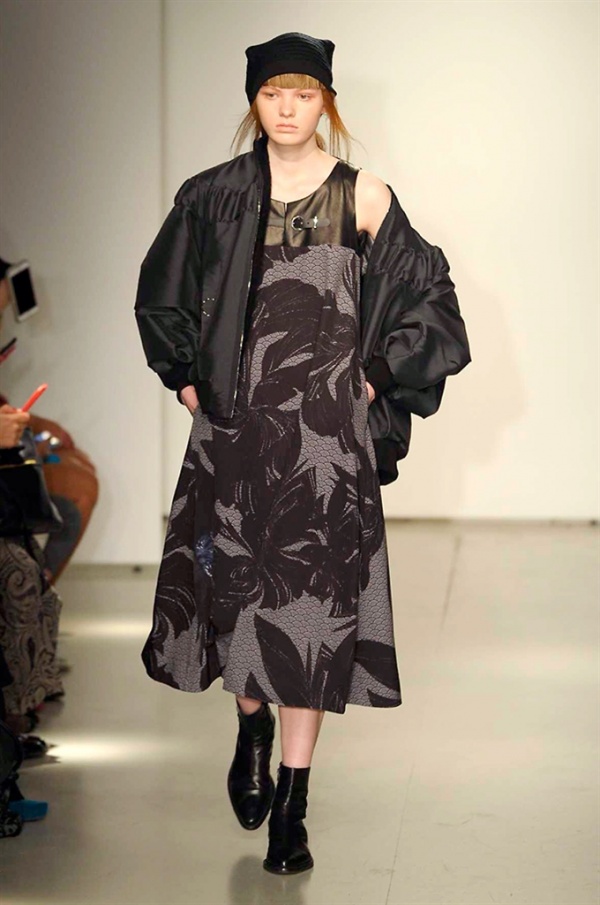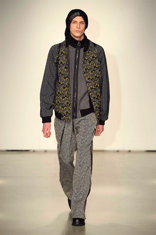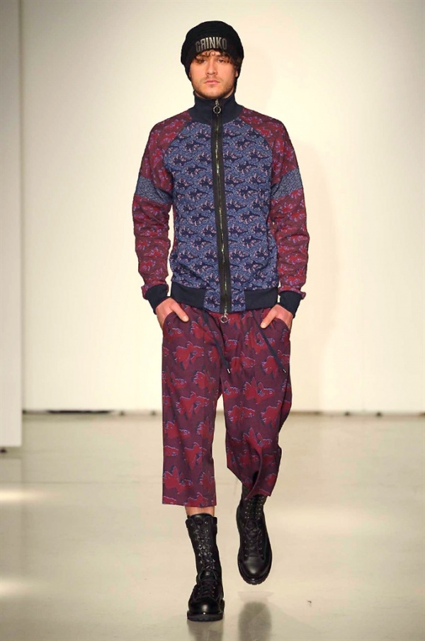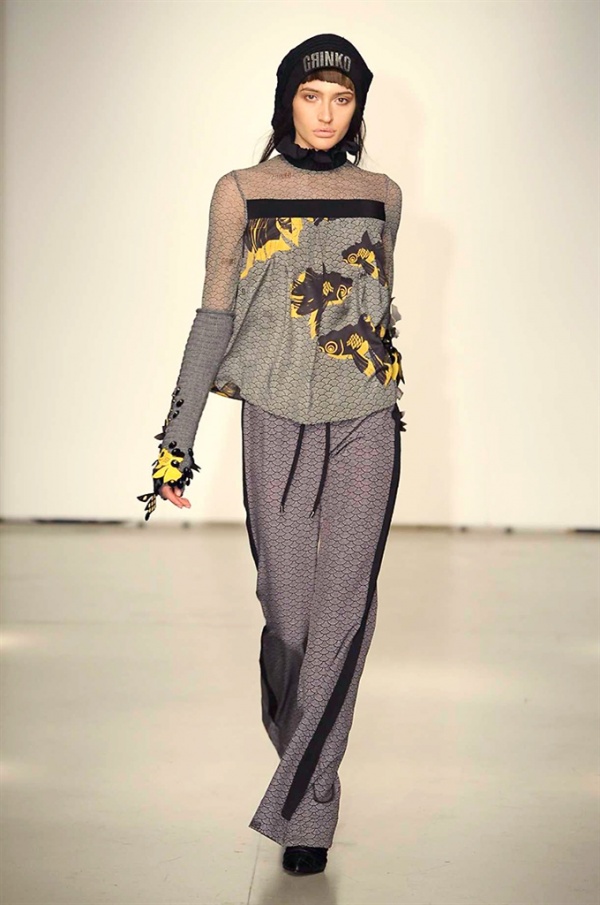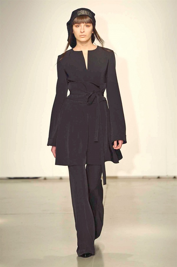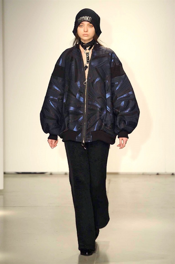 La prima collezione ad aprile le danze della settimana della moda è stata quella dello stilista russo Sergei Grinko che ha presentato la sua Belief+Doubt=Sanity, dove la parola chiave per svelarne il concept è “sperimentazione”, in passerella hanno sfilato uomini e donne con abiti che richiamano diversi stili e epoche, dal barocco al punk, con contaminazioni orientali e stampe del Goldenfish come simbolo, restano punti fermi i riferimenti vittoriani. Indumento icona della collezione è il bomber oversize, lavorato con tessuti broccati sui toni del blu.