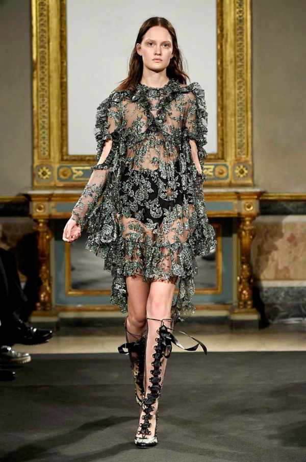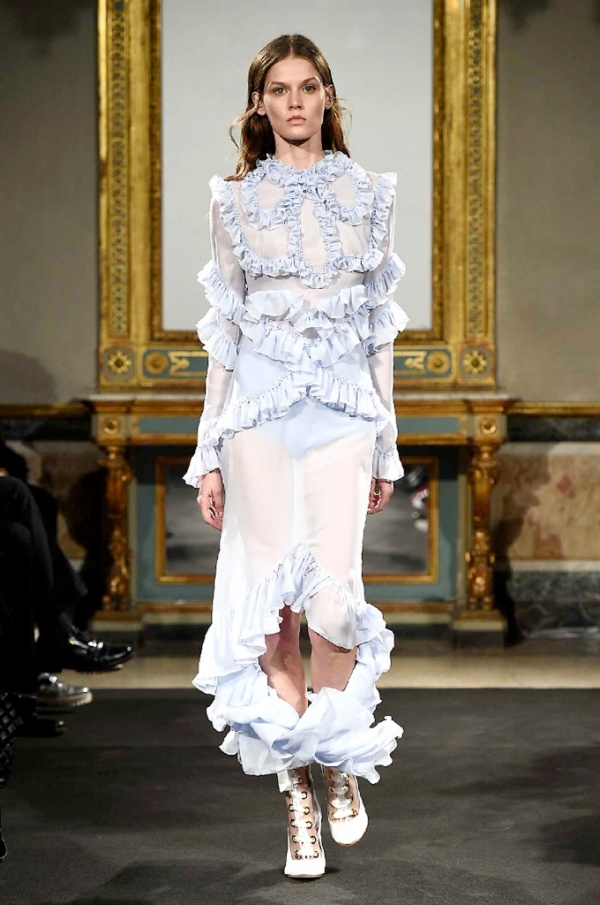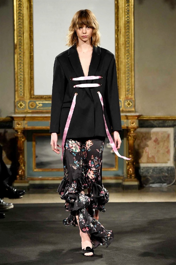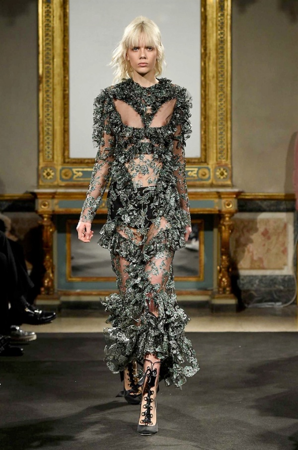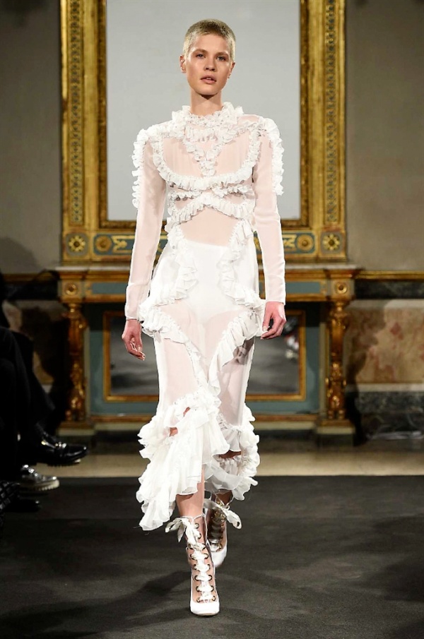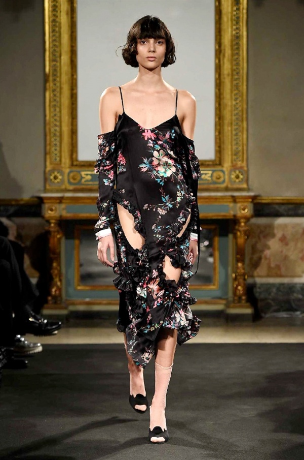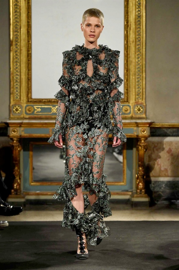 Elegantissimi abiti strappati sfilano sulla passerella per la collezione A/I 2016-17 di Francesco Scognamiglio dove i frammenti diventano drappeggi di ruches e i tagli si trasformano in cascate di volant.