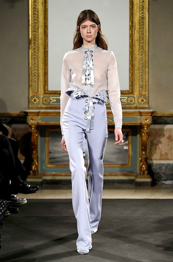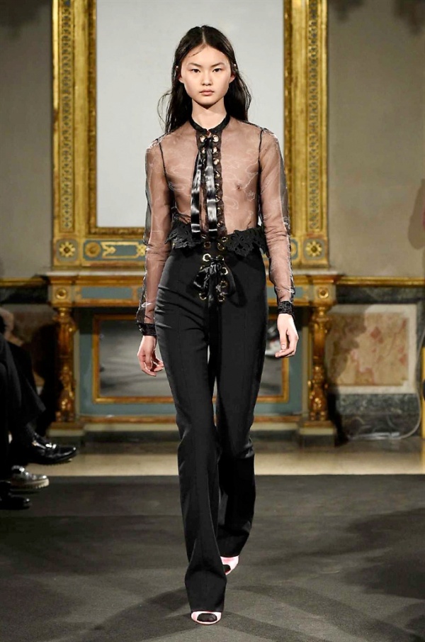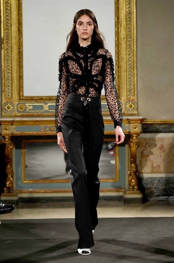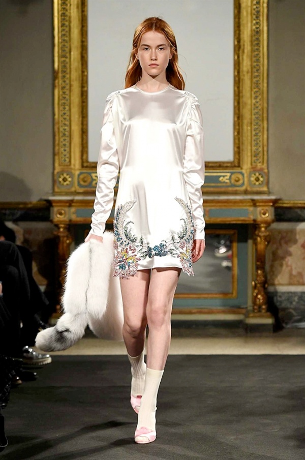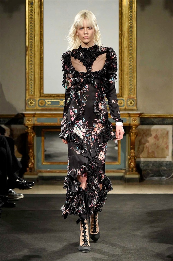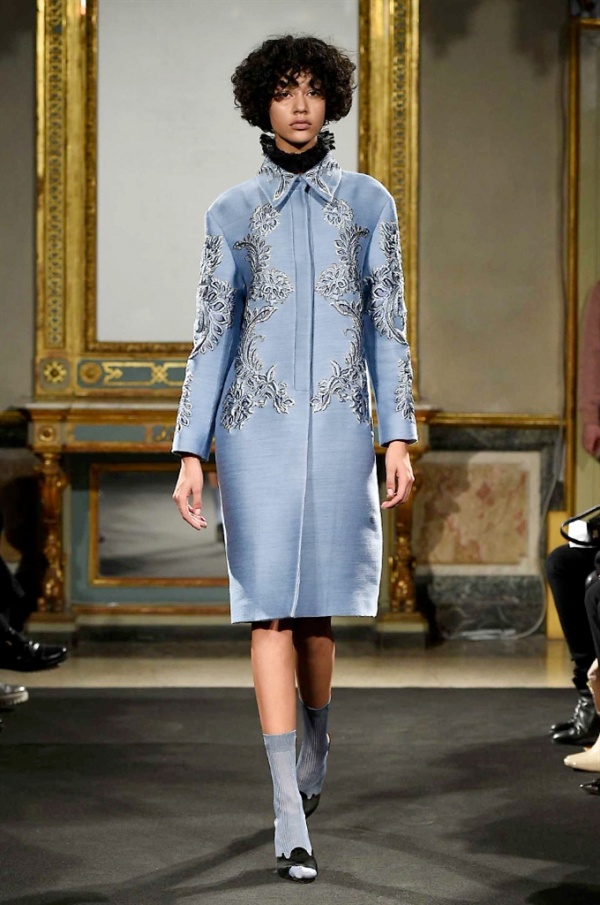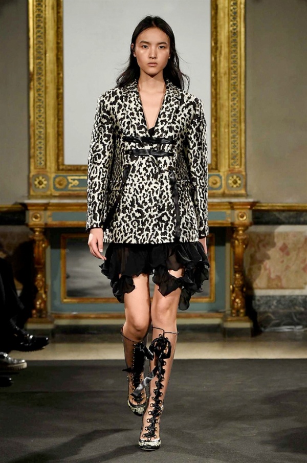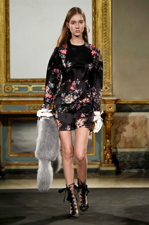 Elegantissimi abiti strappati sfilano sulla passerella per la collezione A/I 2016-17 di Francesco Scognamiglio dove i frammenti diventano drappeggi di ruches e i tagli si trasformano in cascate di volant.