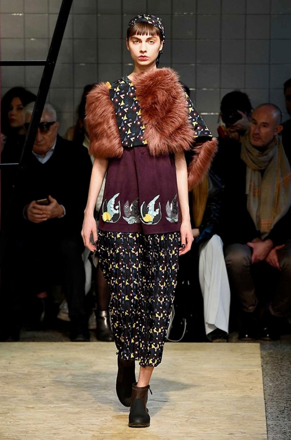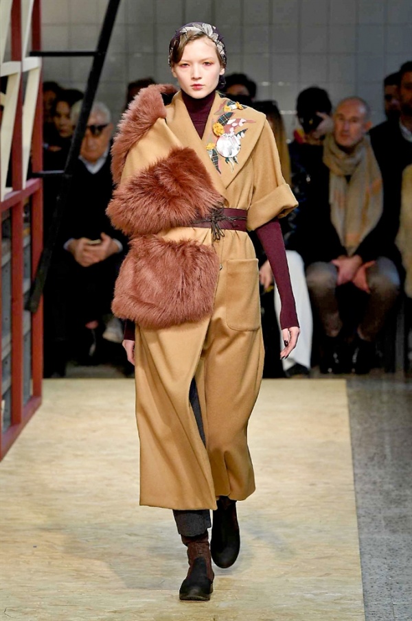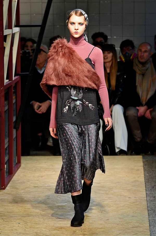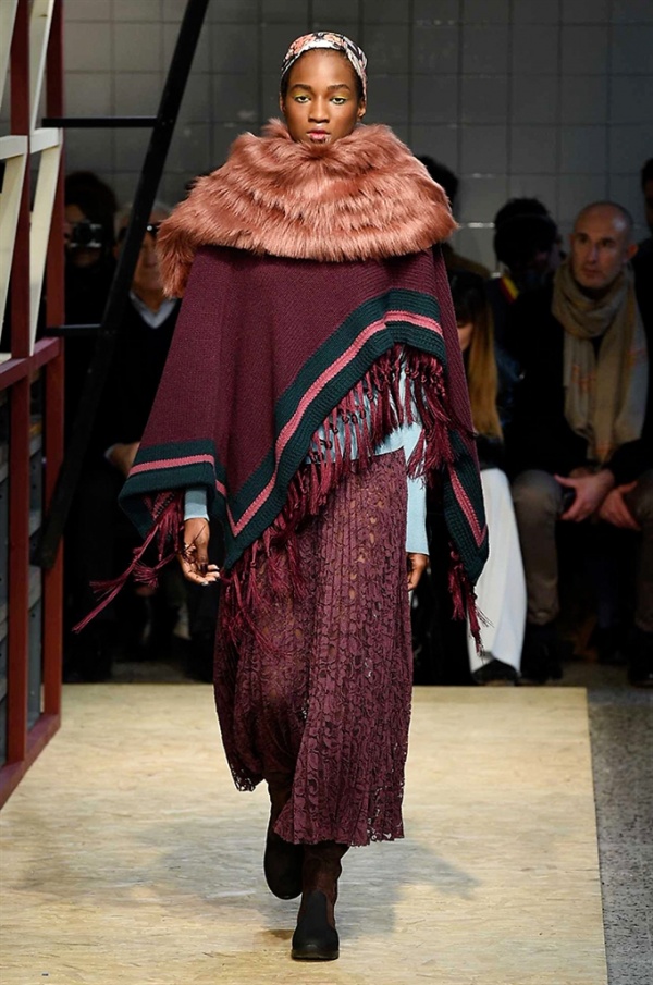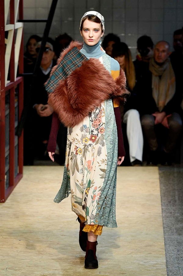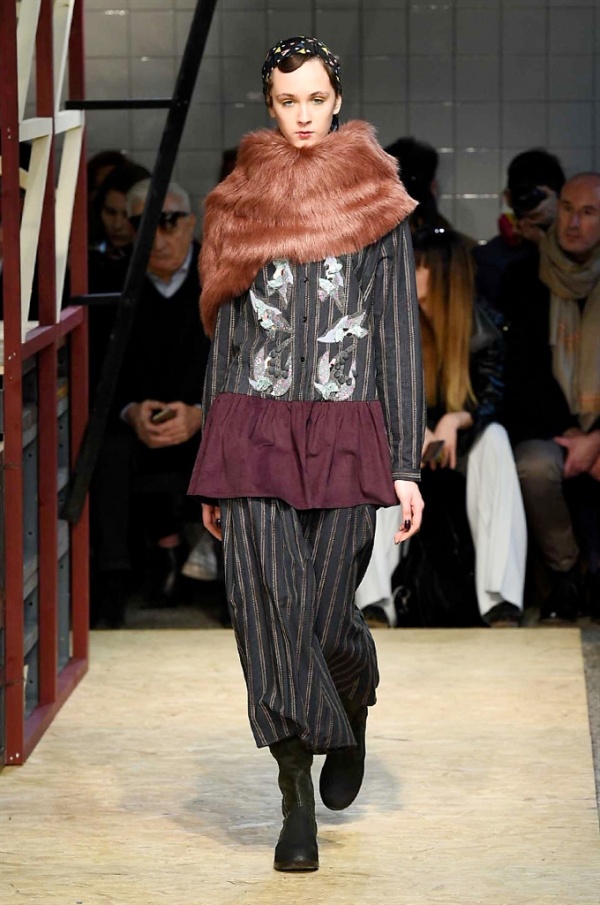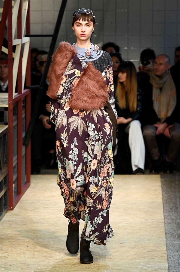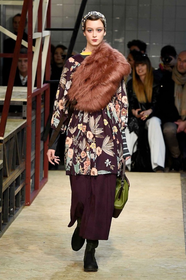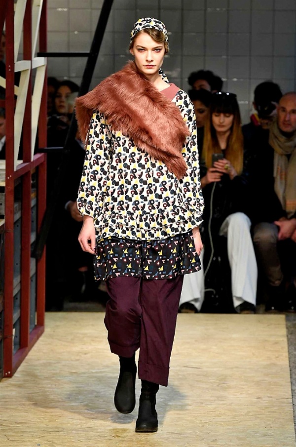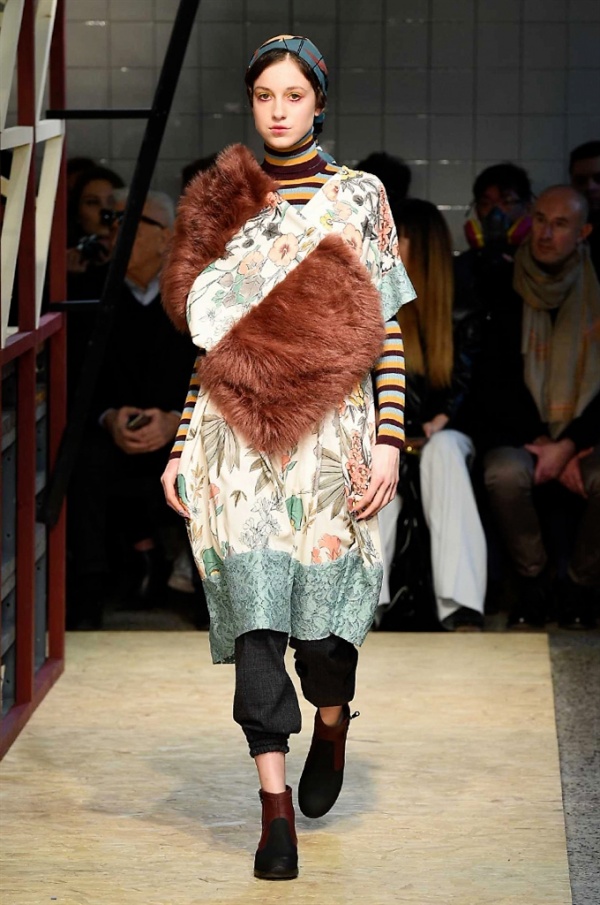 Lo stilista sardo Marras ha presentato la sua nuova collezione I’m Isola Marras A/I 2016-17 ispirata al costruttivismo russo, grandi stole in pelliccia sintetica e foulard in testa fermati da forcine. In contrasto con la rigidità delle stampe ci sono fiori, righe, jacquard e pizzi che ammorbidiscono i capi.