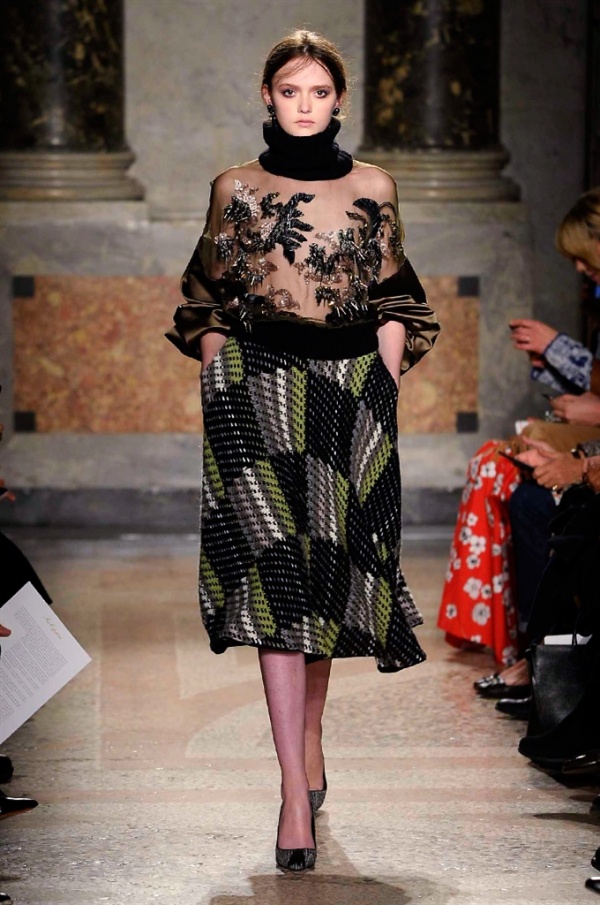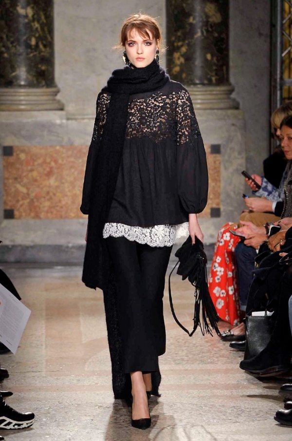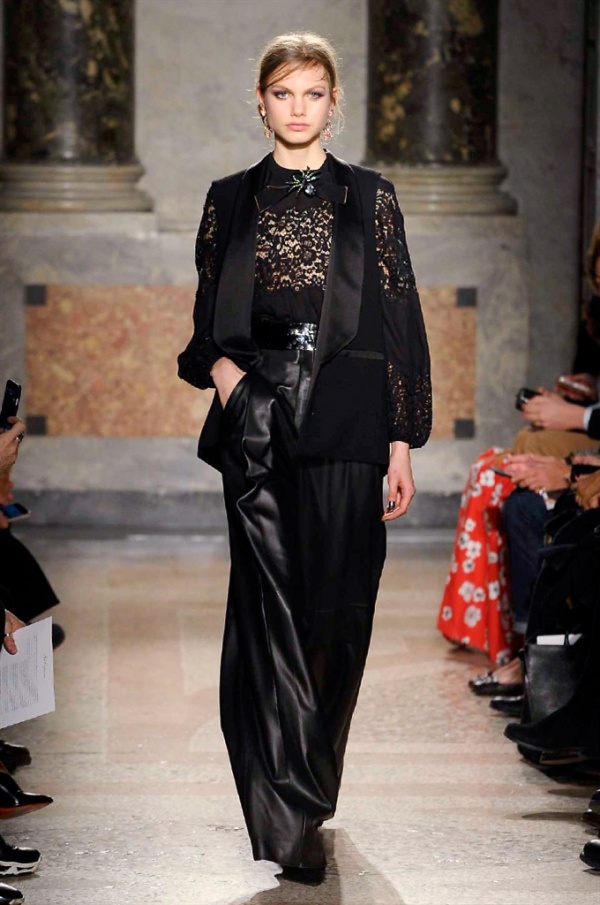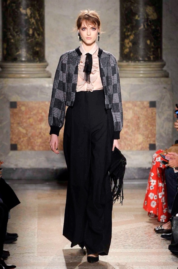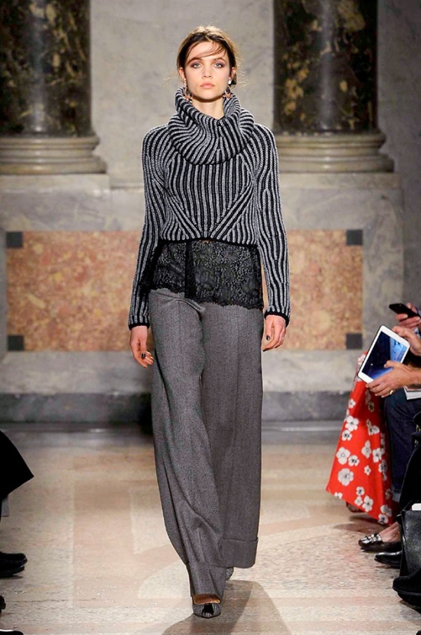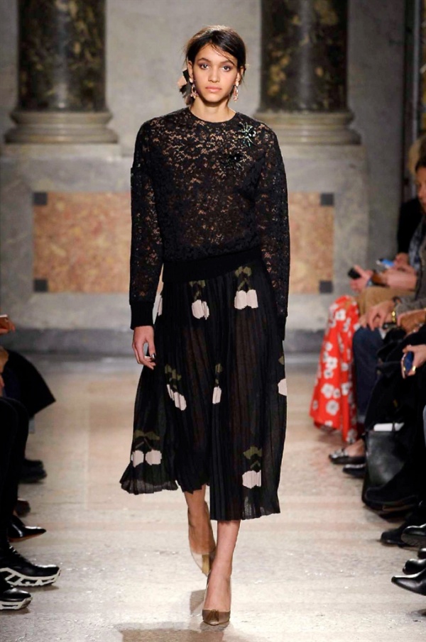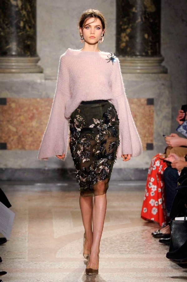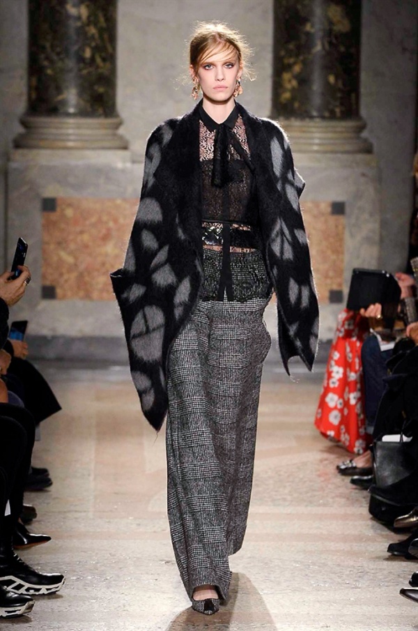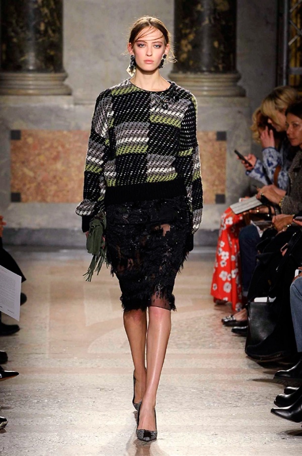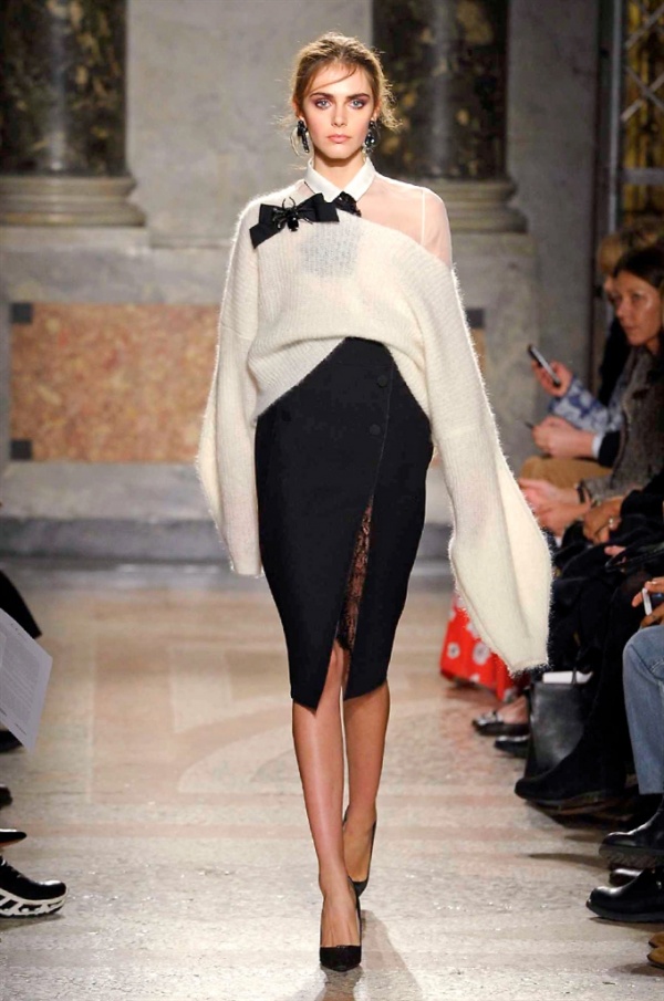 Grande protagonista in tutta la collezione la maglieria, lavorata con tecnica a intarsio e jacquard, i cardigan sono maxi e i pullover mini con maniche a corolla e tessuti in principe di Galles, oppure con modelli a collo alto e un’apertura totale sulla schiena che lascia intravedere la pelle nuda. I pantaloni maschili sono accostati a materiali satinati e plissé, sovrapposti a ruches. Le gonne a tubo sono a vita altissima, impreziosite da ricami, inserti in pizzo e spacchi. La palette cromatica è sui toni del nero, del rosa cipria e del verde.