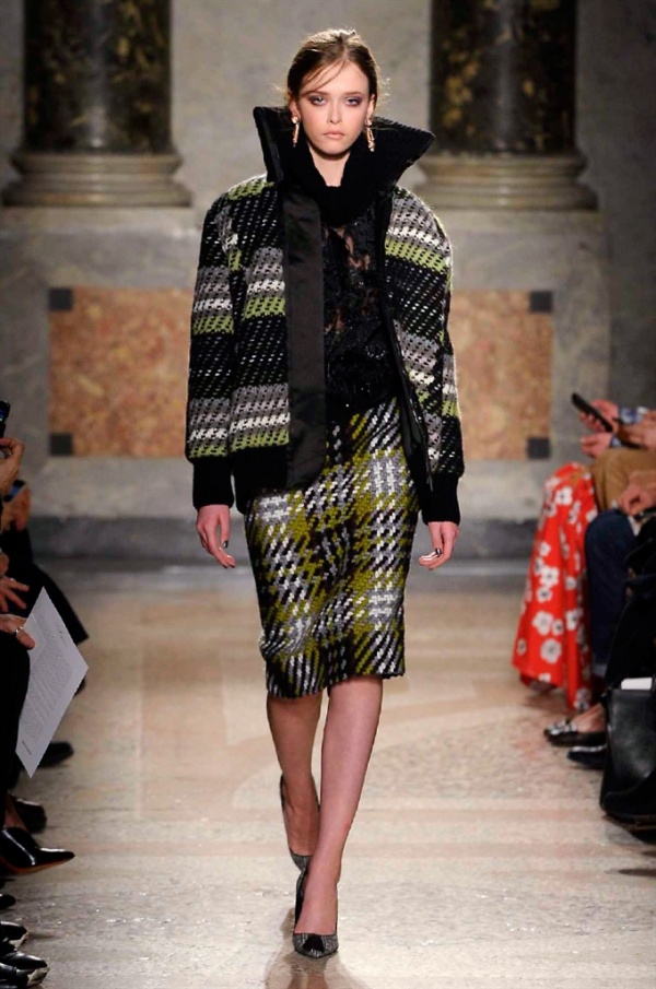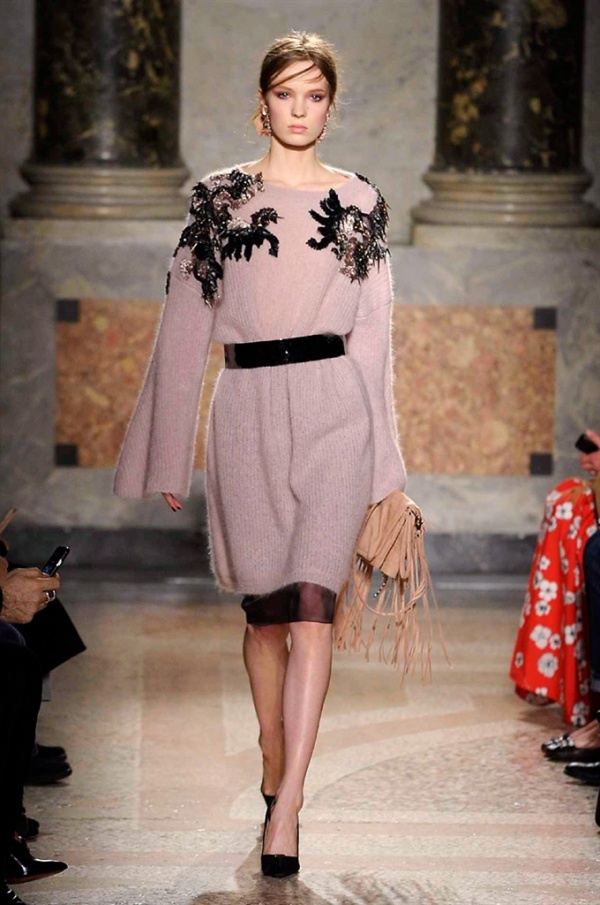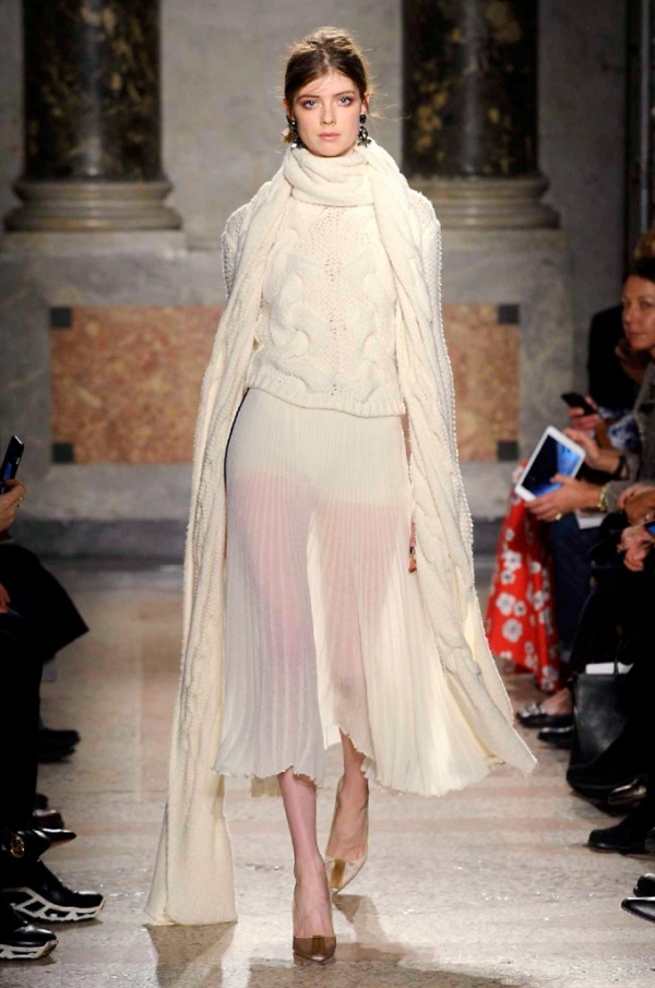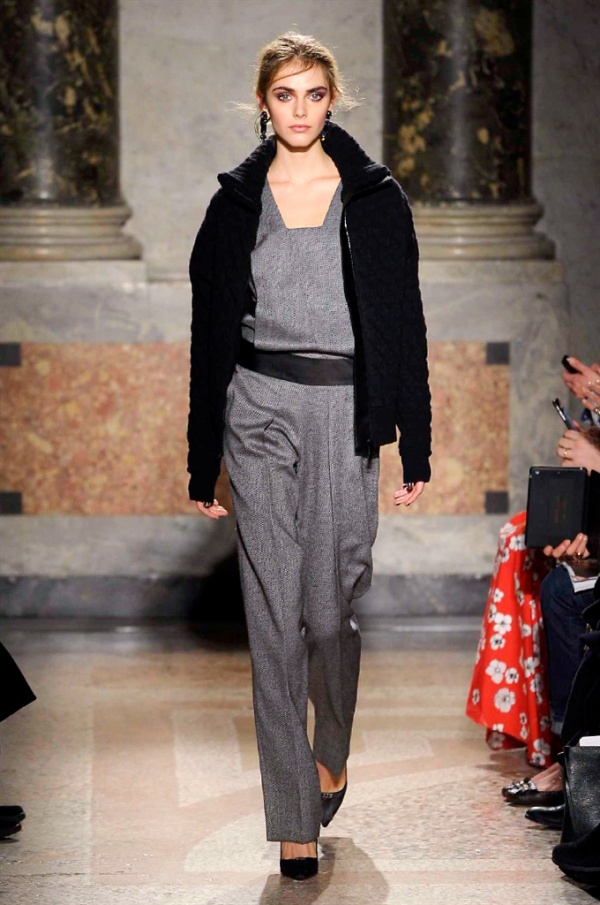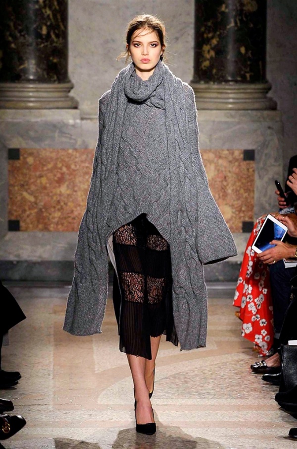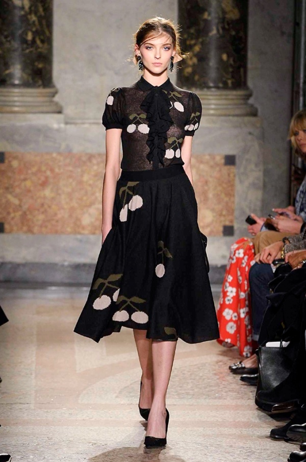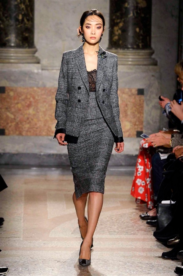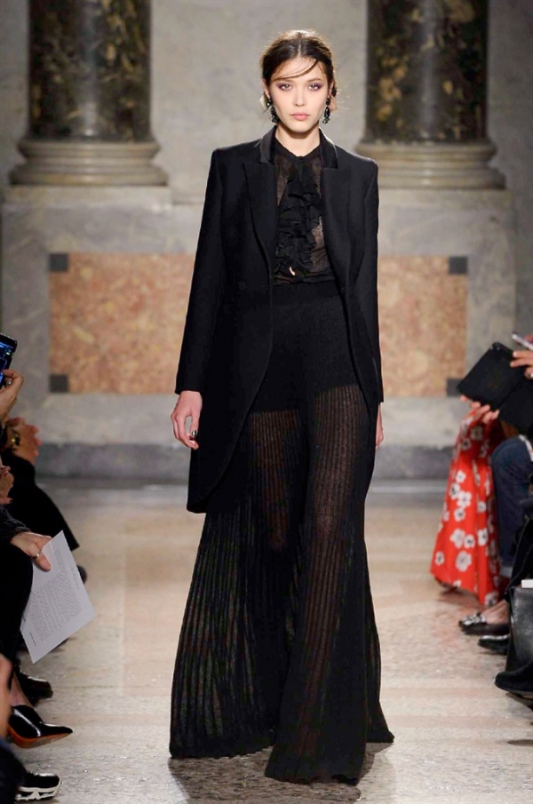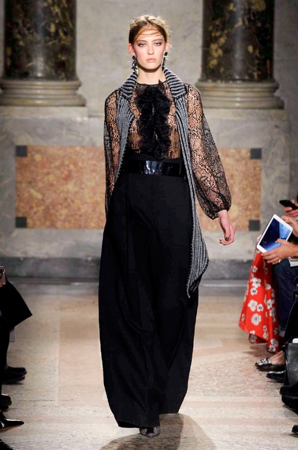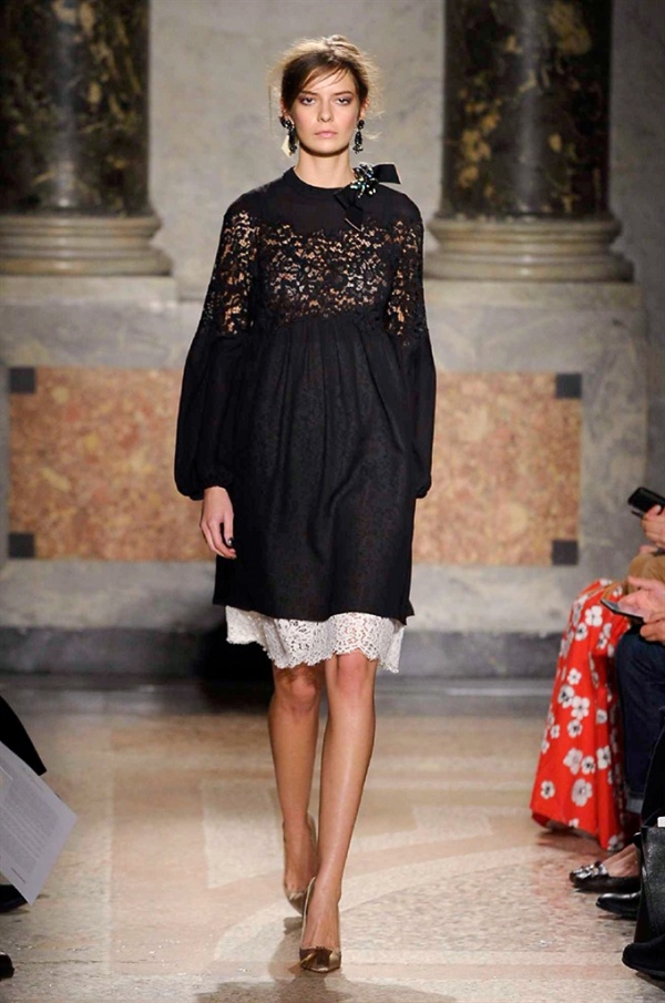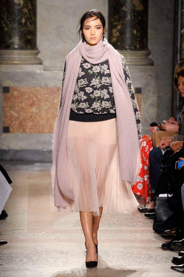 Grande protagonista in tutta la collezione la maglieria, lavorata con tecnica a intarsio e jacquard, i cardigan sono maxi e i pullover mini con maniche a corolla e tessuti in principe di Galles, oppure con modelli a collo alto e un’apertura totale sulla schiena che lascia intravedere la pelle nuda. I pantaloni maschili sono accostati a materiali satinati e plissé, sovrapposti a ruches. Le gonne a tubo sono a vita altissima, impreziosite da ricami, inserti in pizzo e spacchi. La palette cromatica è sui toni del nero, del rosa cipria e del verde.