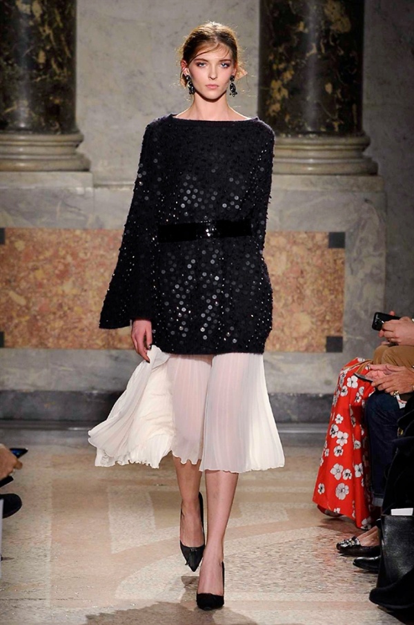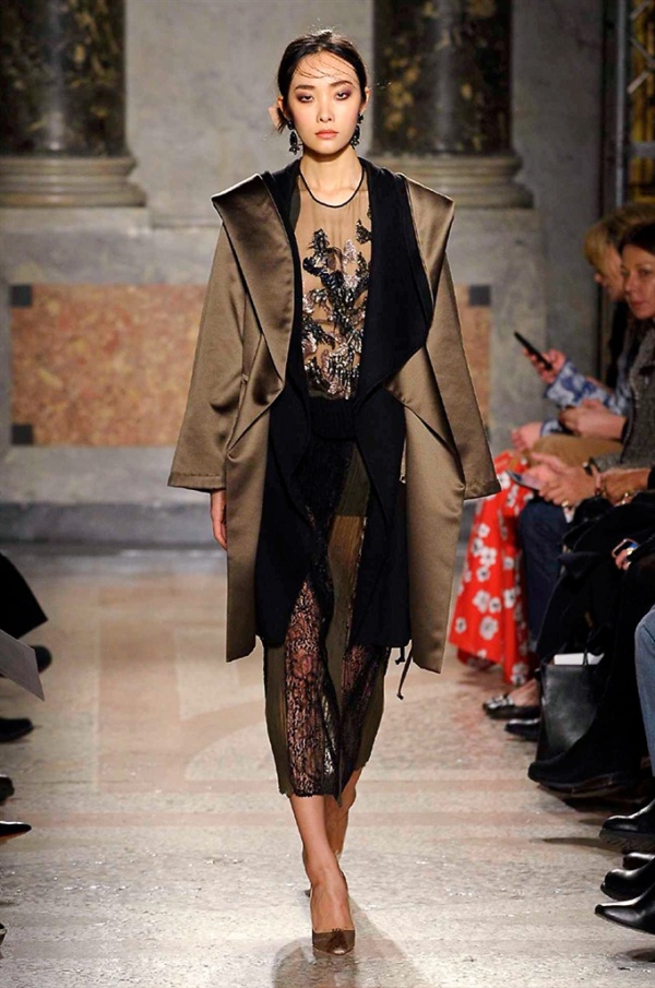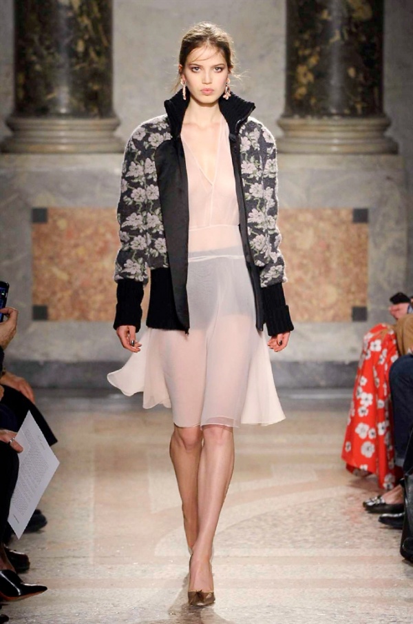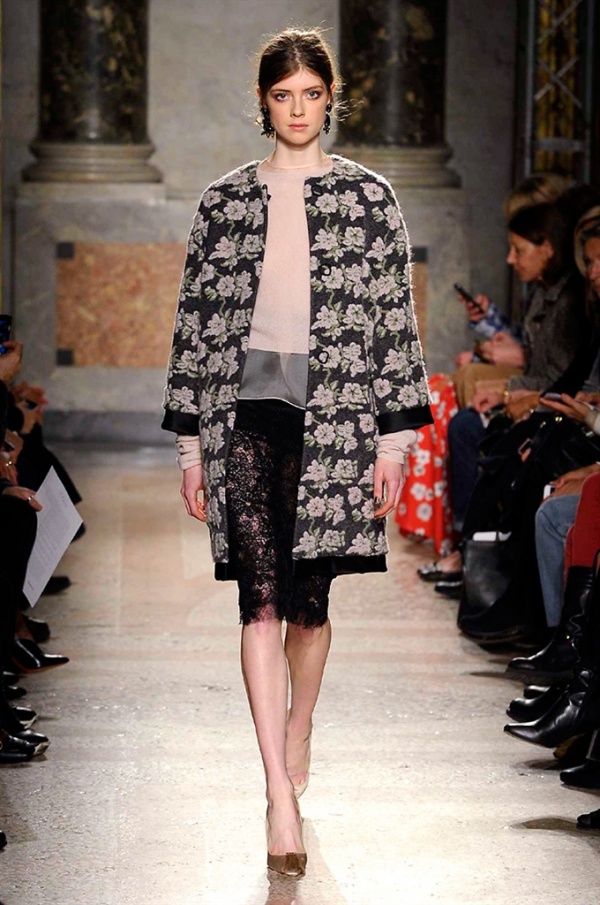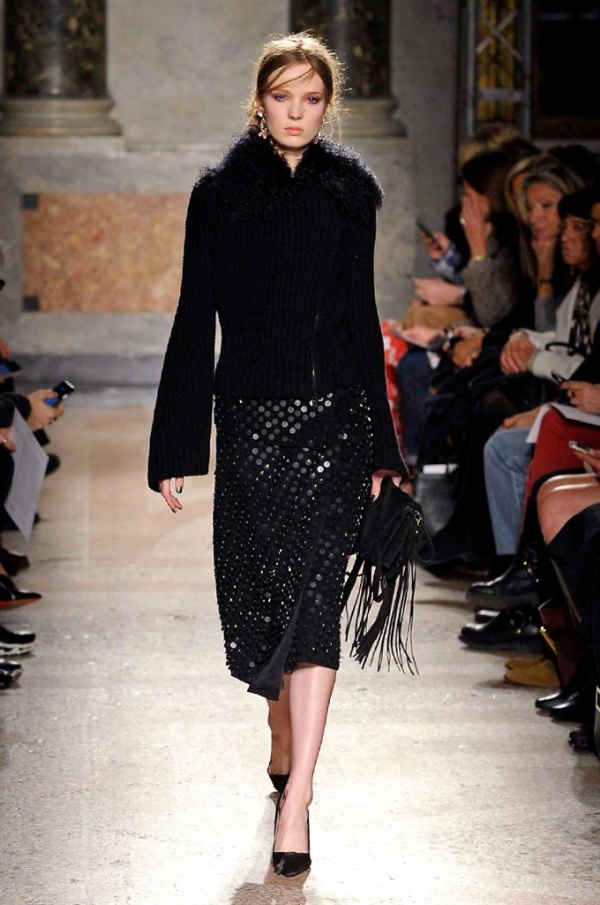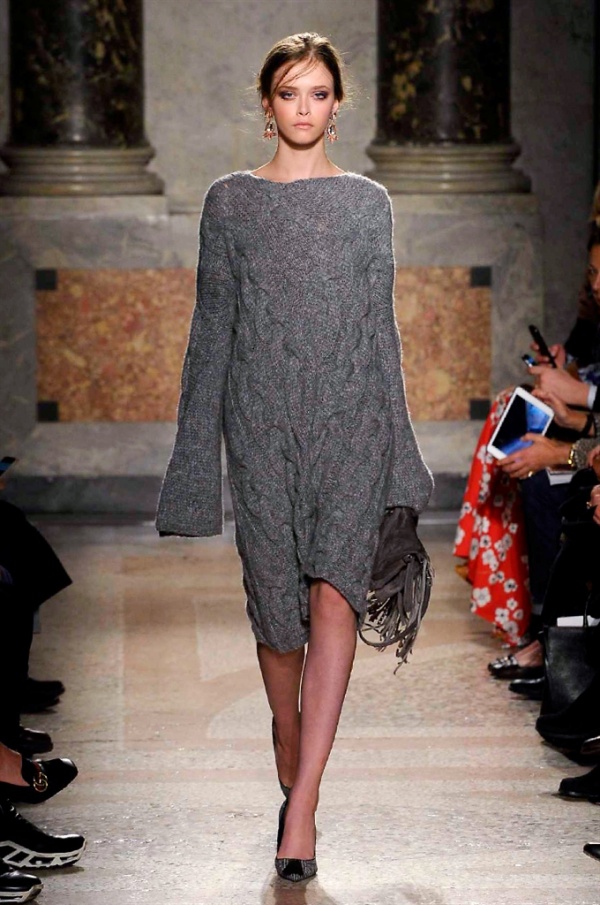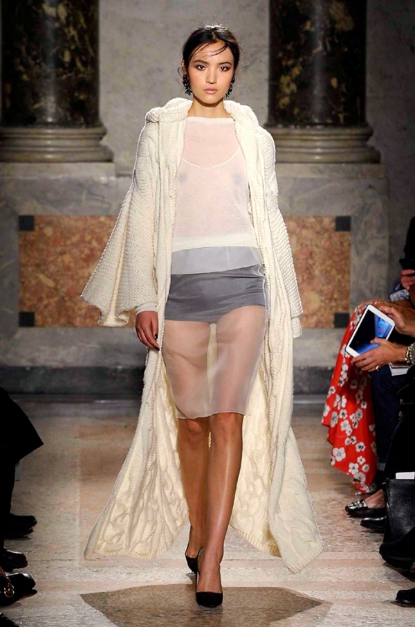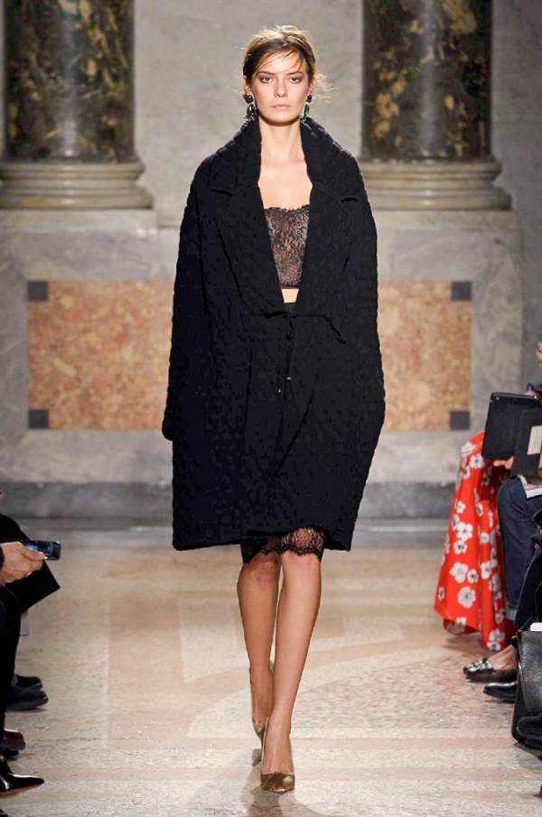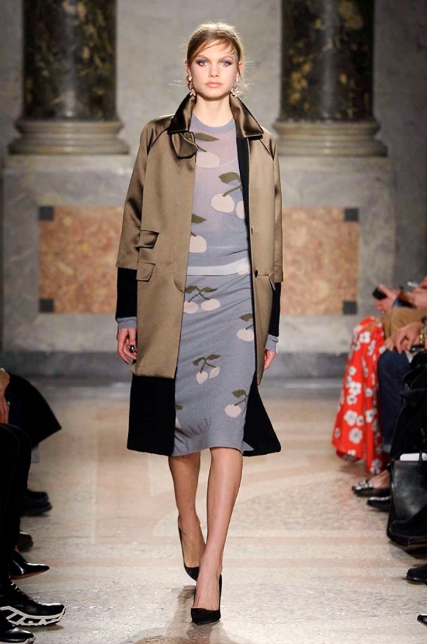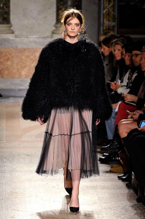 Grande protagonista in tutta la collezione la maglieria, lavorata con tecnica a intarsio e jacquard, i cardigan sono maxi e i pullover mini con maniche a corolla e tessuti in principe di Galles, oppure con modelli a collo alto e un’apertura totale sulla schiena che lascia intravedere la pelle nuda. I pantaloni maschili sono accostati a materiali satinati e plissé, sovrapposti a ruches. Le gonne a tubo sono a vita altissima, impreziosite da ricami, inserti in pizzo e spacchi. La palette cromatica è sui toni del nero, del rosa cipria e del verde.