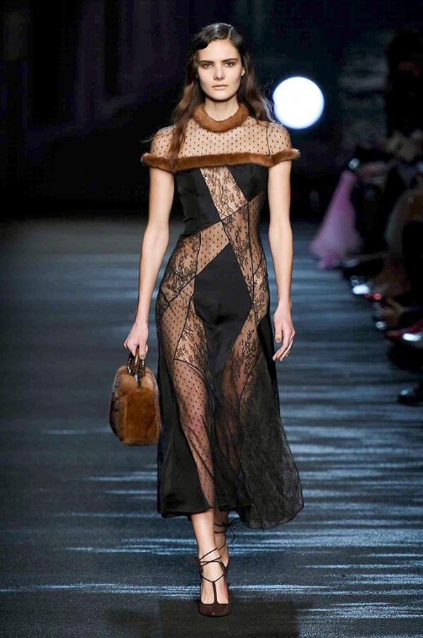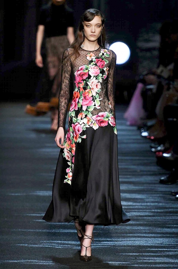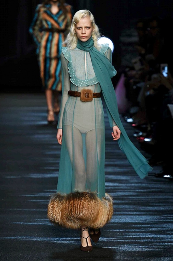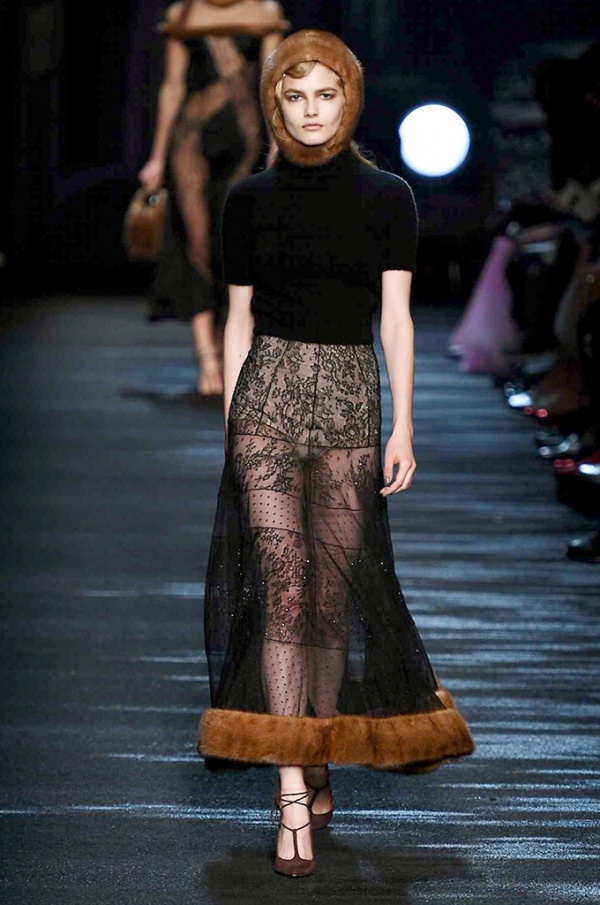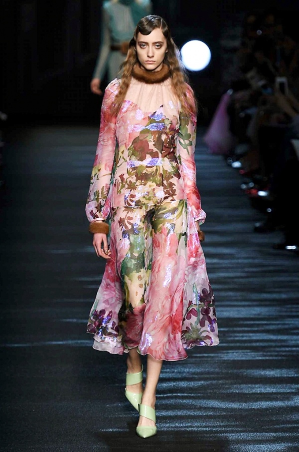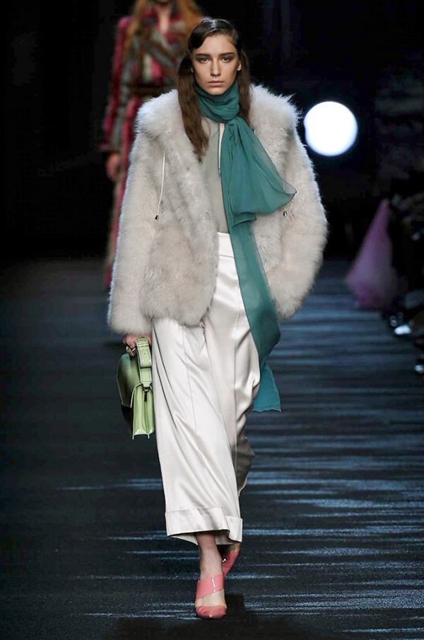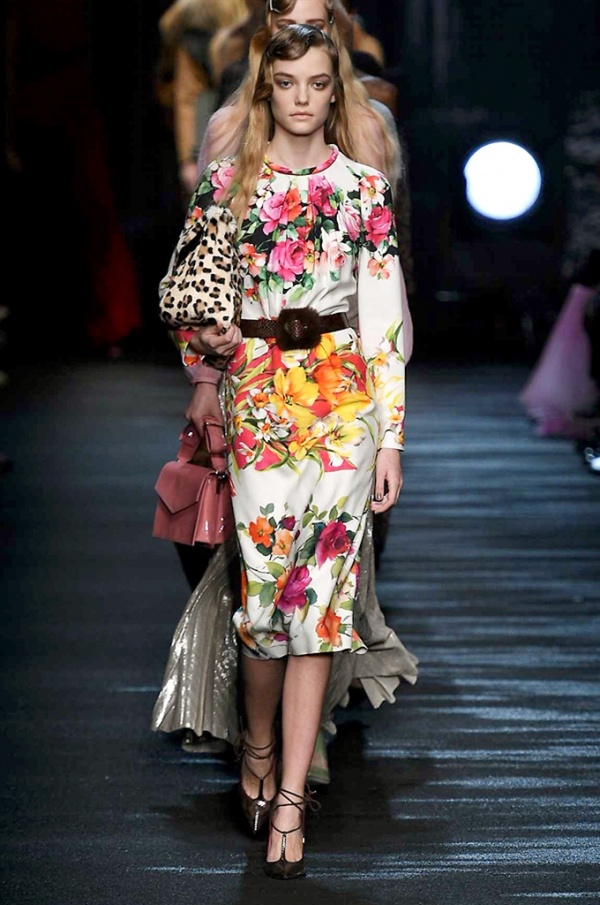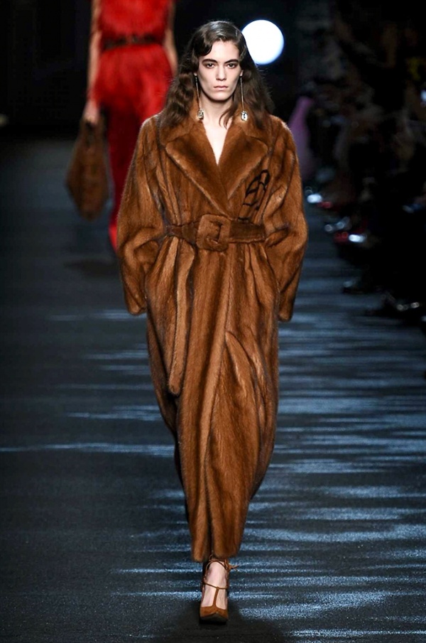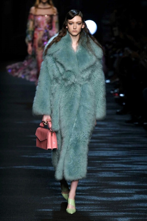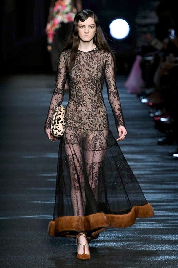 I cappotti in visone sono avvolgenti e si alternano ai lunghi abiti in chiffon, le pellicce colorate si indossano sulle bluse in seta stampata, forte l’impatto del pizzo impreziosito dai famosi fiori. La palette usata è sui toni del bianco, nero, marrone, rosa, argento e grigio, gli accessori fondamentali diventano le decollettes con tacco scultura, orecchini e cuffie in visone, borse a tracolla in pelle o maxi in pelliccia.