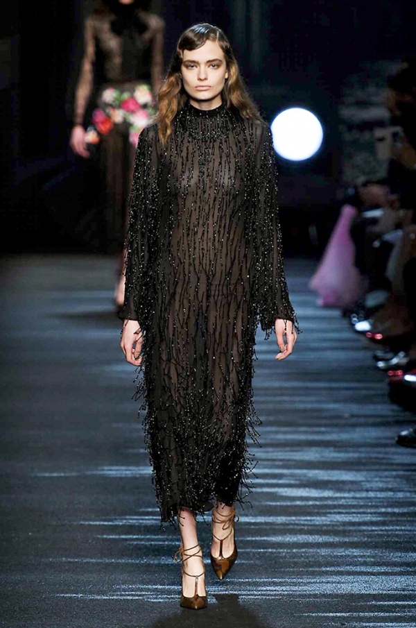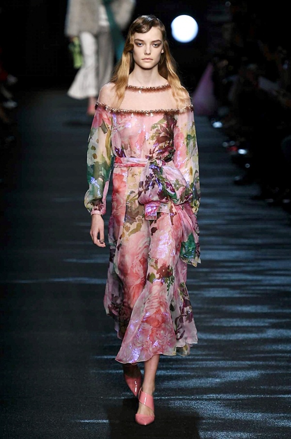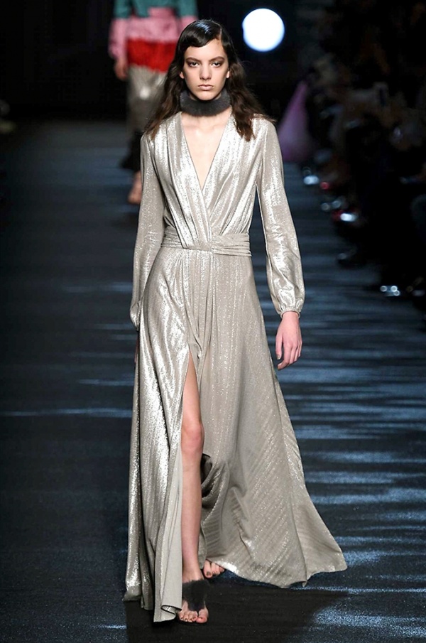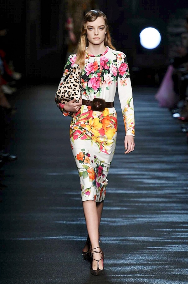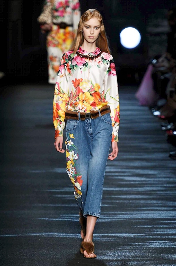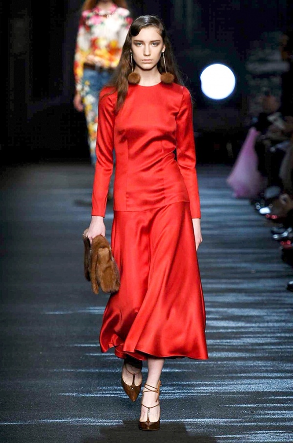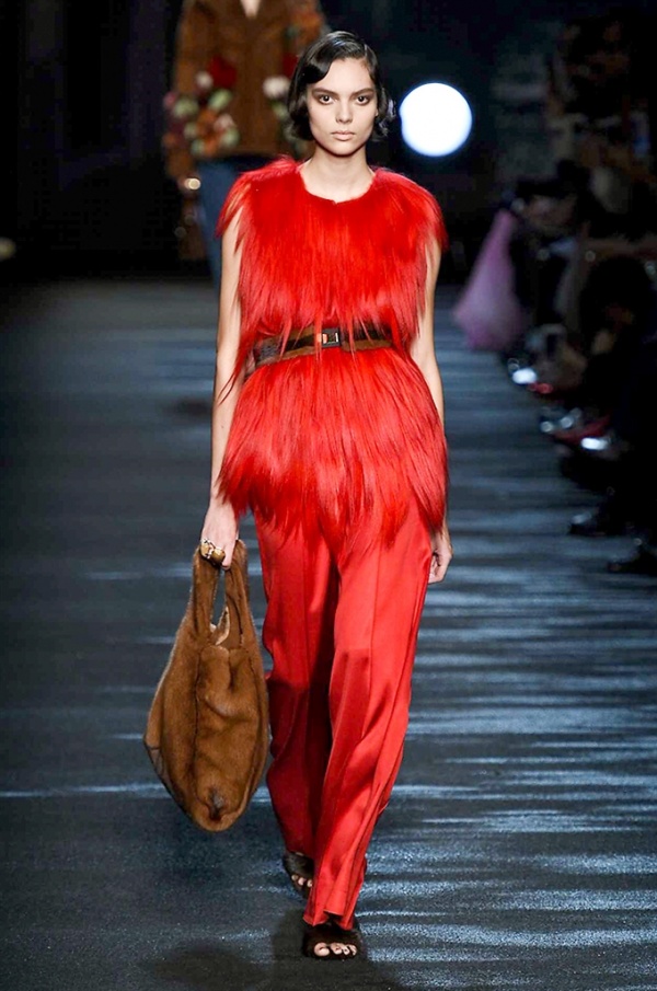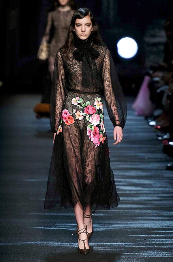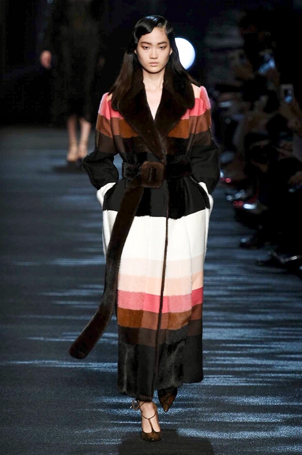 I cappotti in visone sono avvolgenti e si alternano ai lunghi abiti in chiffon, le pellicce colorate si indossano sulle bluse in seta stampata, forte l’impatto del pizzo impreziosito dai famosi fiori. La palette usata è sui toni del bianco, nero, marrone, rosa, argento e grigio, gli accessori fondamentali diventano le decollettes con tacco scultura, orecchini e cuffie in visone, borse a tracolla in pelle o maxi in pelliccia.