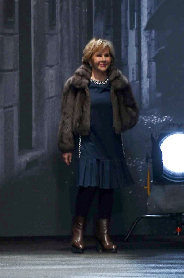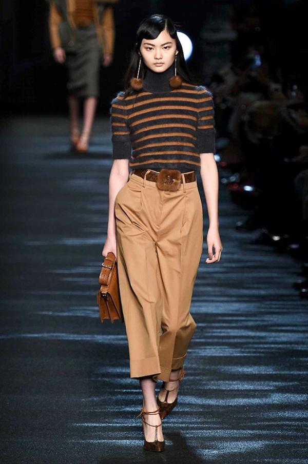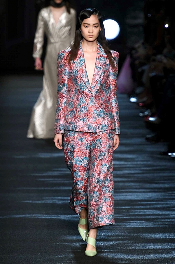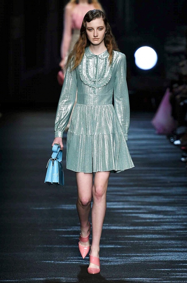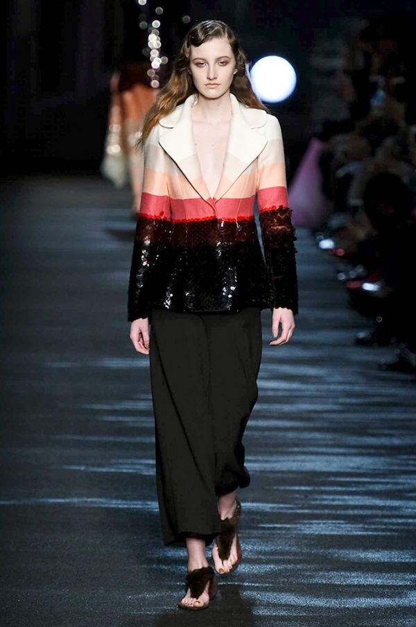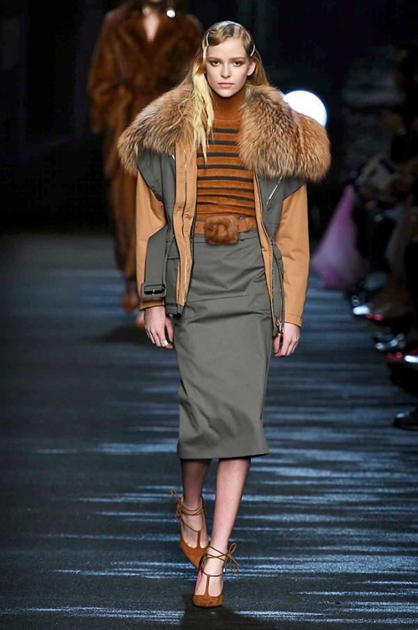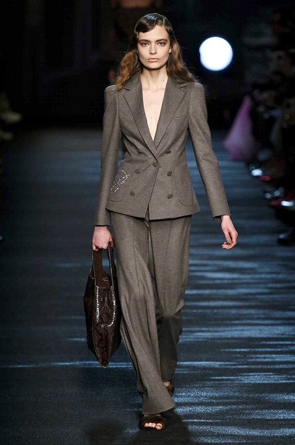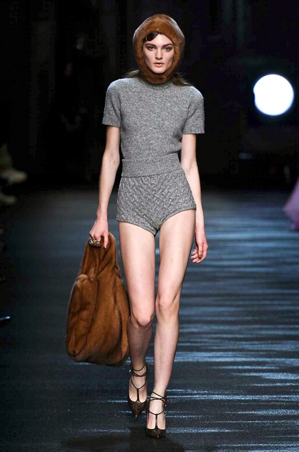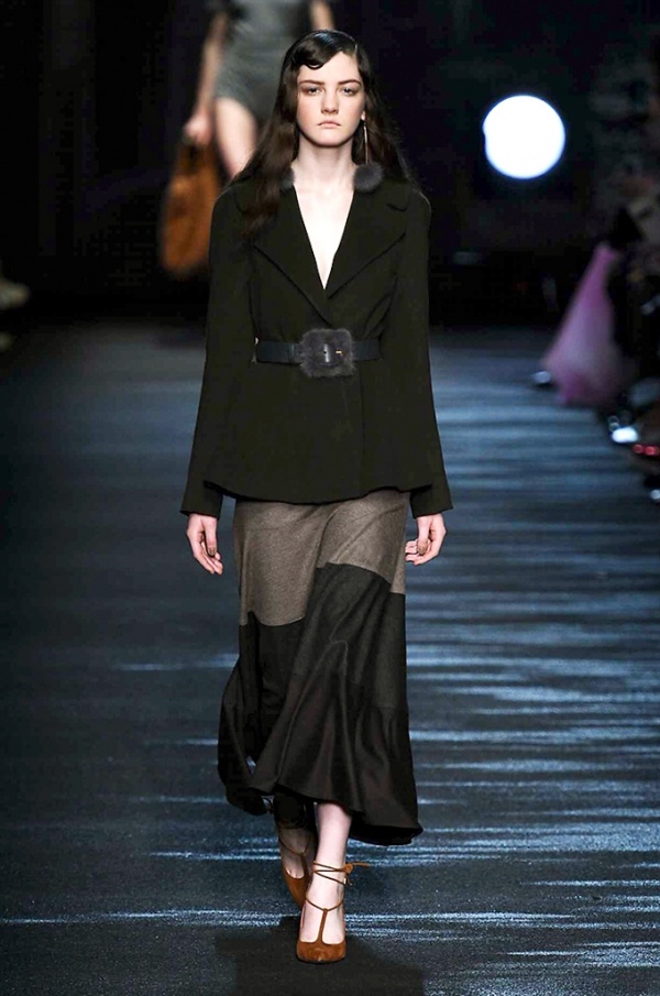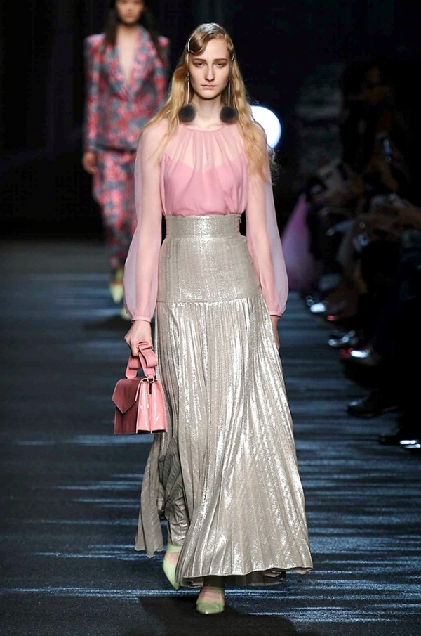 I cappotti in visone sono avvolgenti e si alternano ai lunghi abiti in chiffon, le pellicce colorate si indossano sulle bluse in seta stampata, forte l’impatto del pizzo impreziosito dai famosi fiori. La palette usata è sui toni del bianco, nero, marrone, rosa, argento e grigio, gli accessori fondamentali diventano le decollettes con tacco scultura, orecchini e cuffie in visone, borse a tracolla in pelle o maxi in pelliccia.