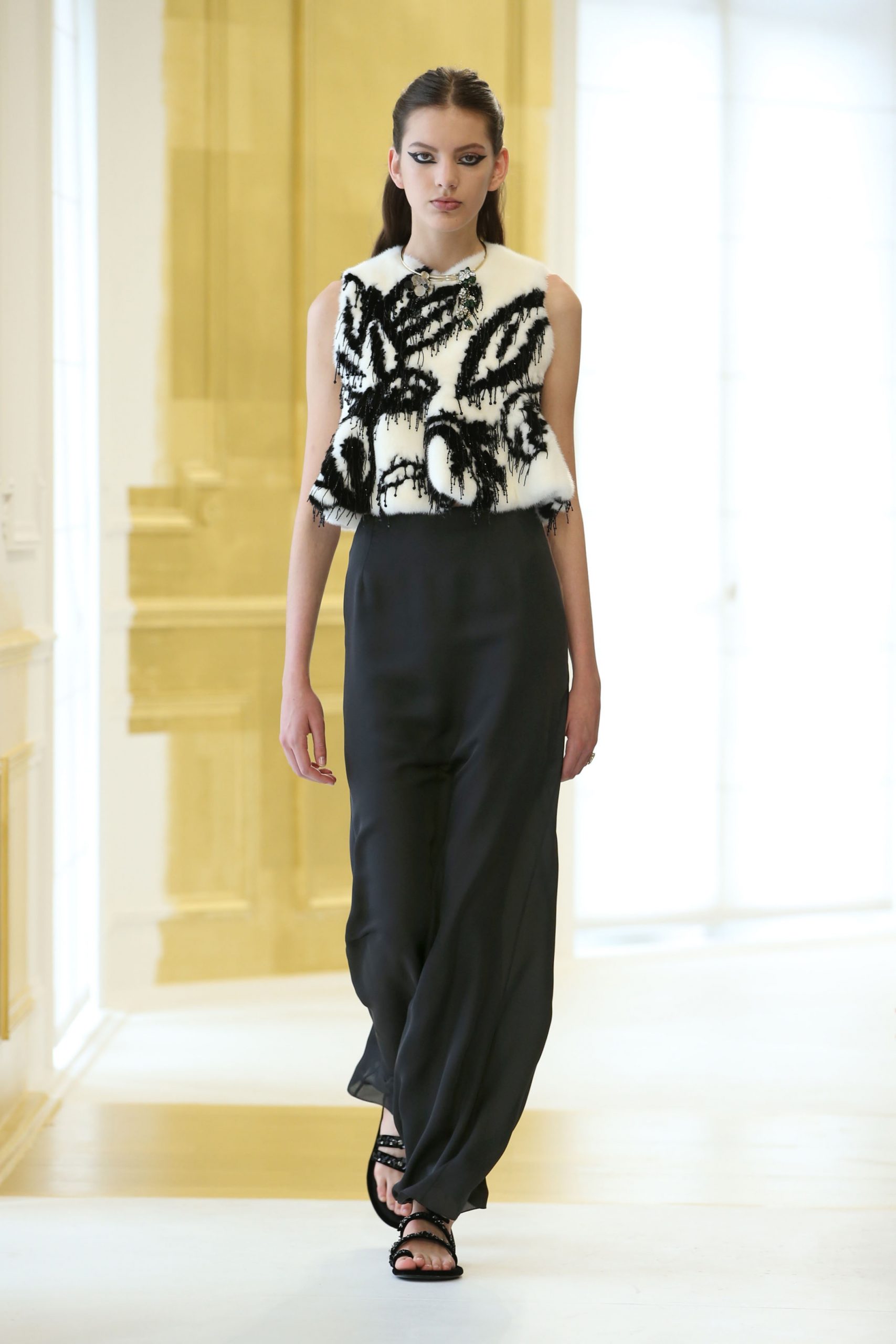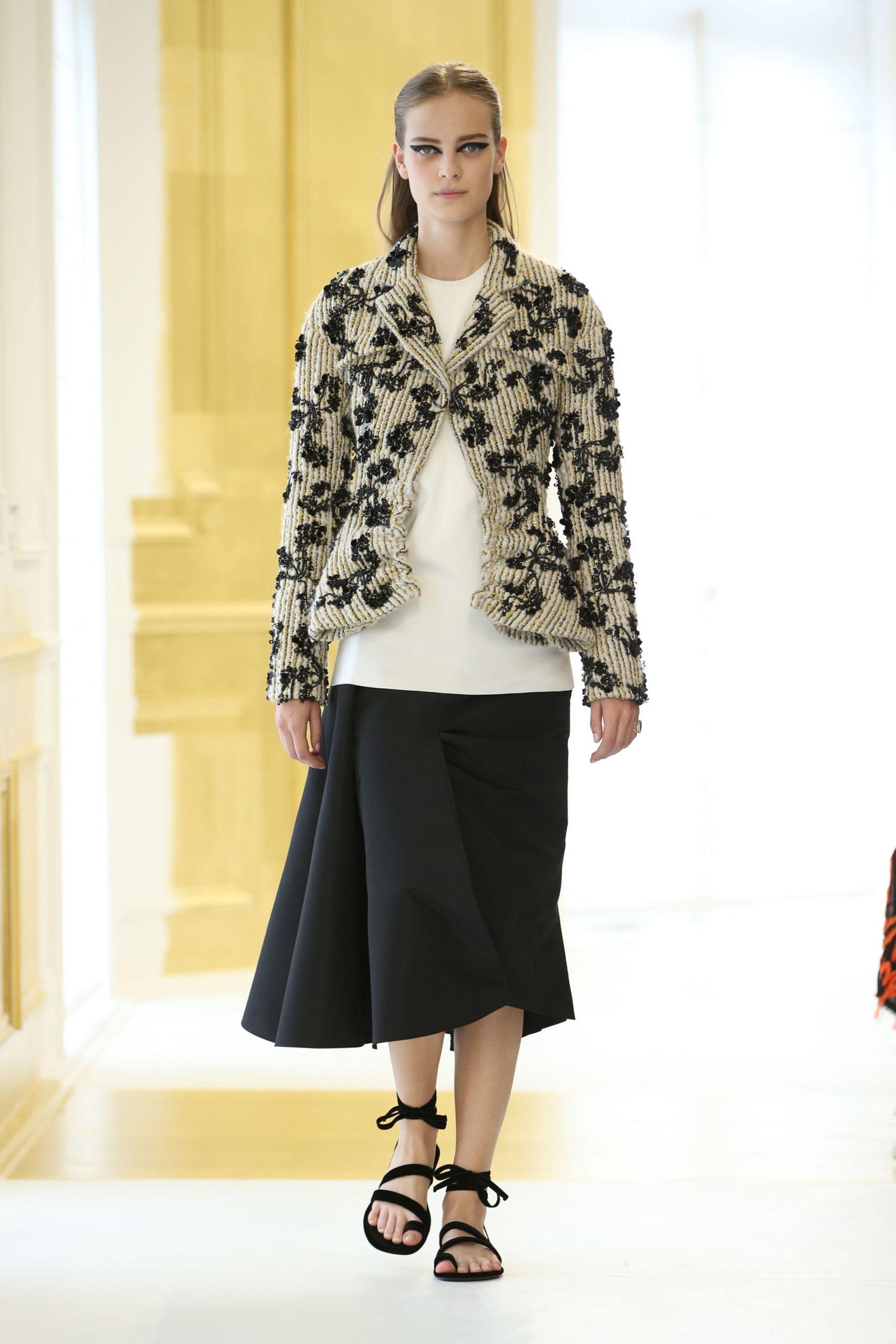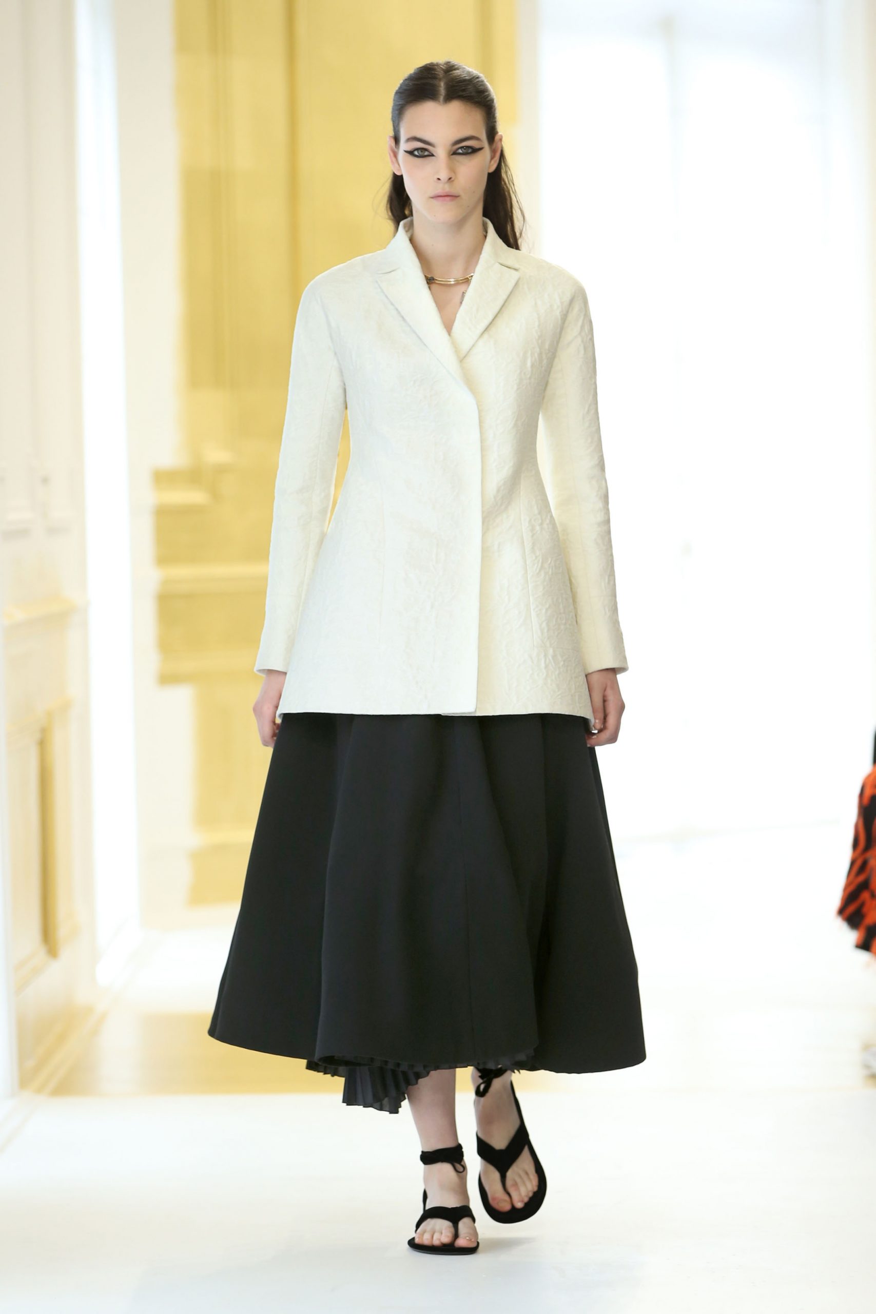 Ma il riferimento non si limita esclusivamente alla forma, la silhouette simbolo costituita da una giacca attillata come una clessidra e da una gonna lunga, ma riprende tutti gli aspetti del tailleur Bar. A cominciare dalla sua palette originale, un brillante contrasto tra bianco e nero, che colora l’intera collezione.