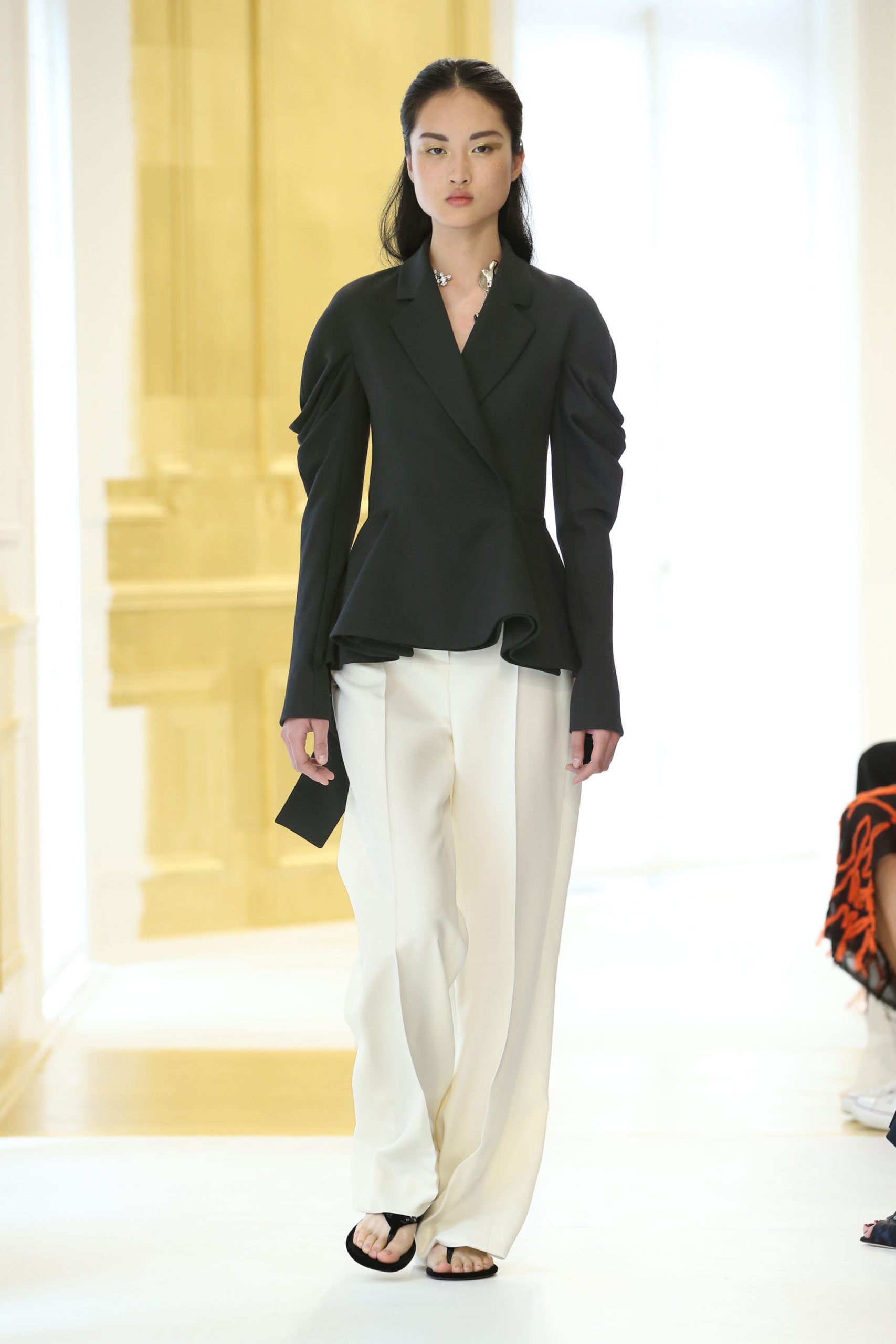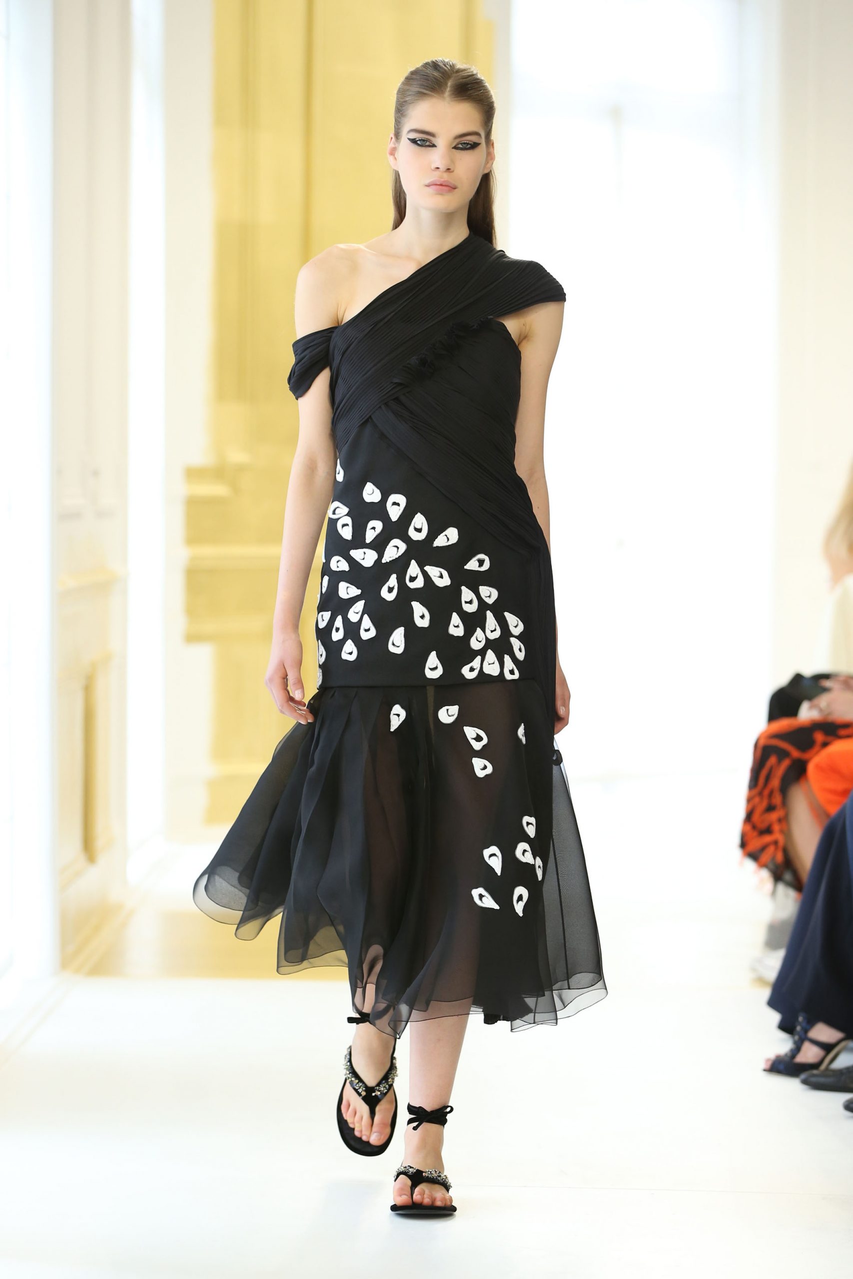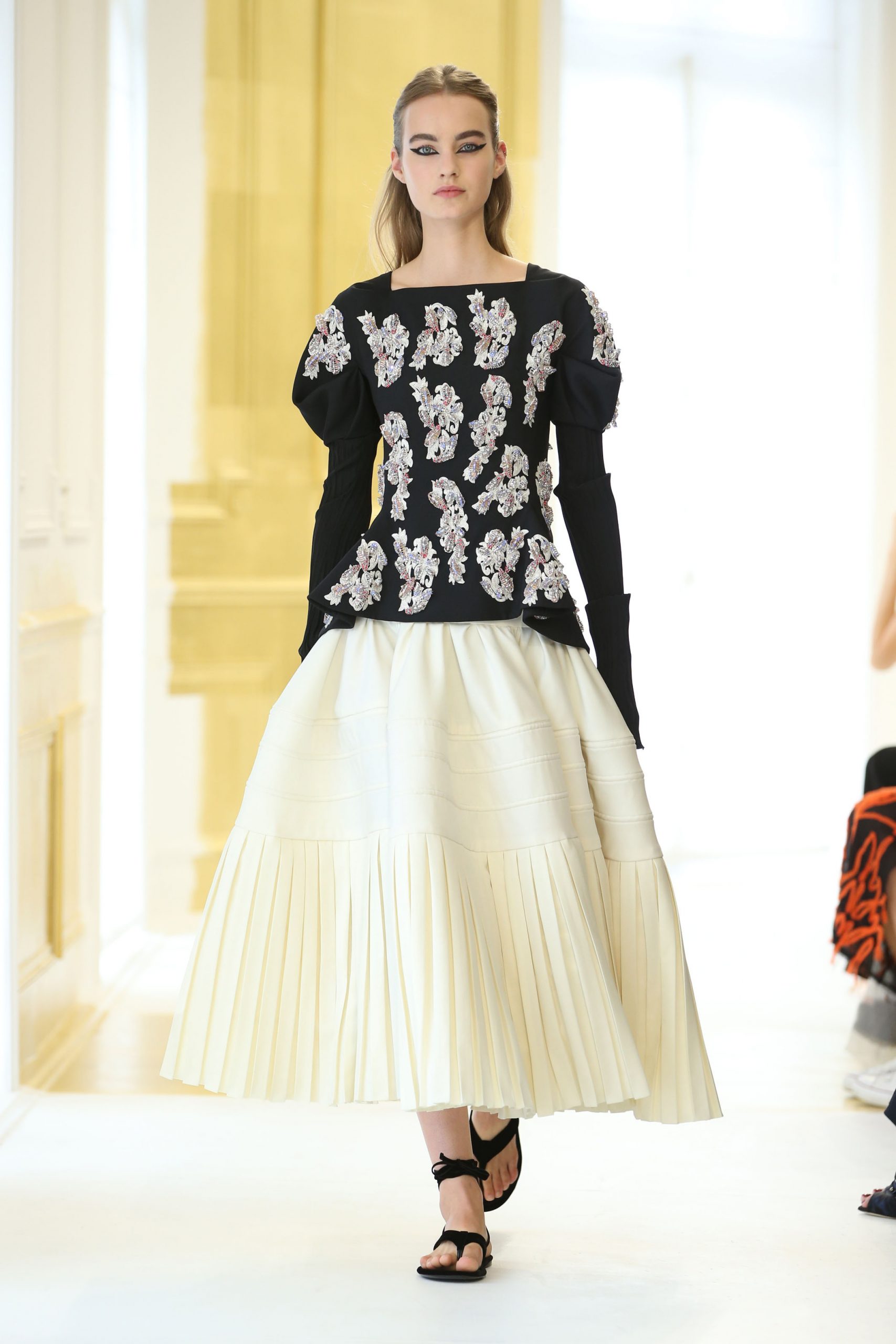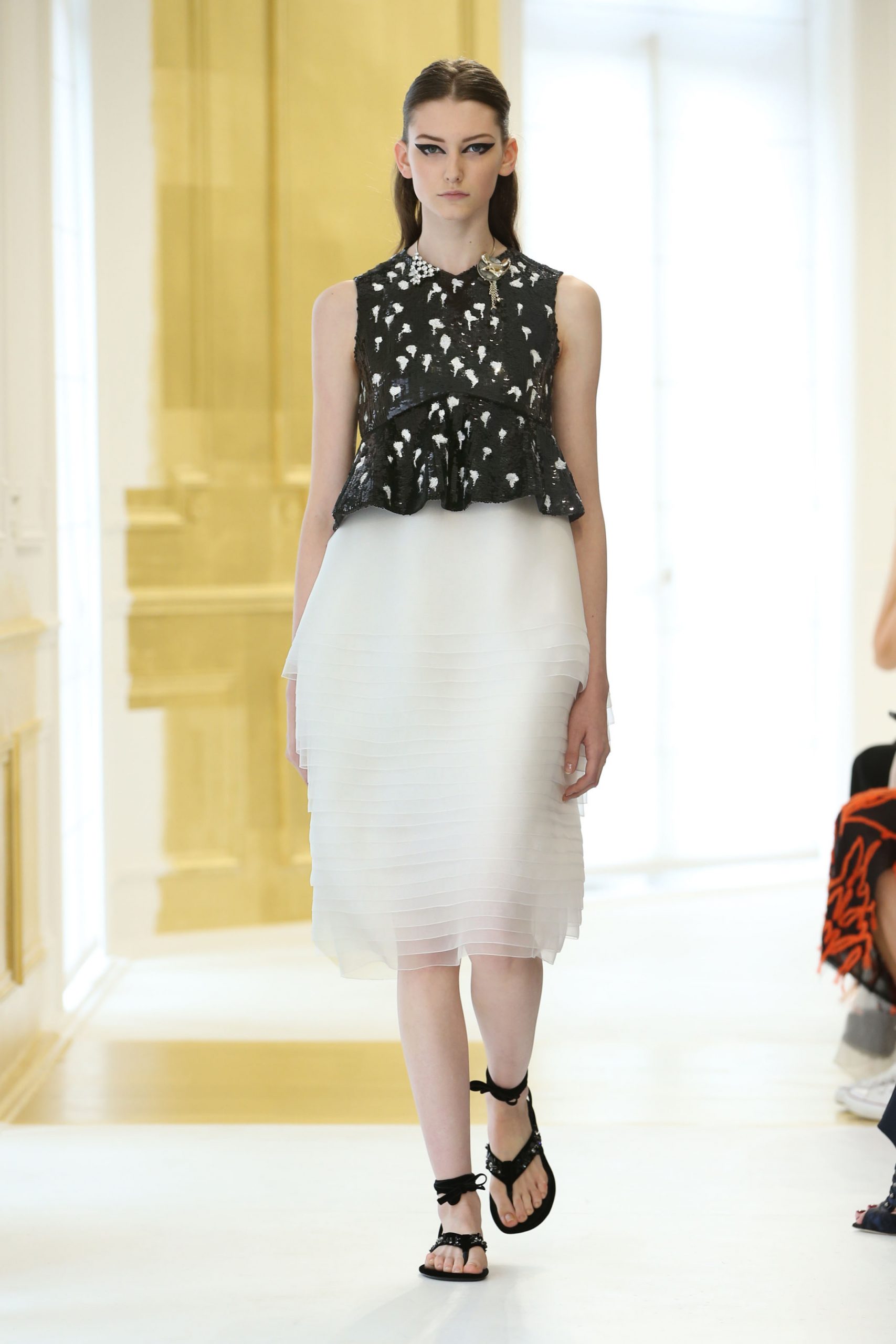Ma il riferimento non si limita esclusivamente alla forma, la silhouette simbolo costituita da una giacca attillata come una clessidra e da una gonna lunga, ma riprende tutti gli aspetti del tailleur Bar. A cominciare dalla sua palette originale, un brillante contrasto tra bianco e nero, che colora l’intera collezione.