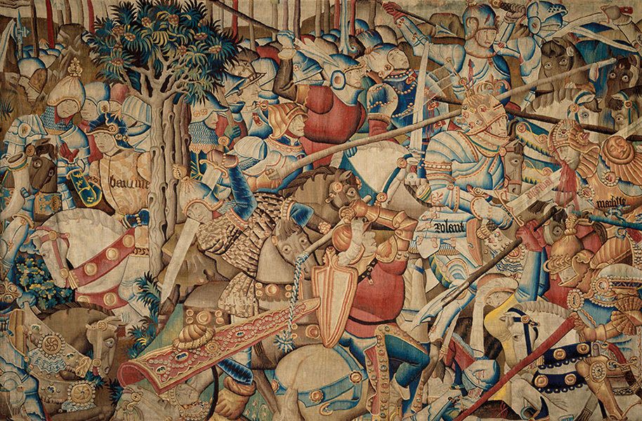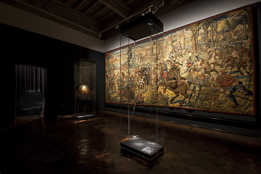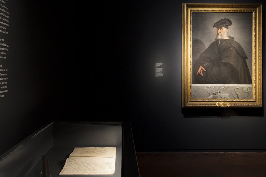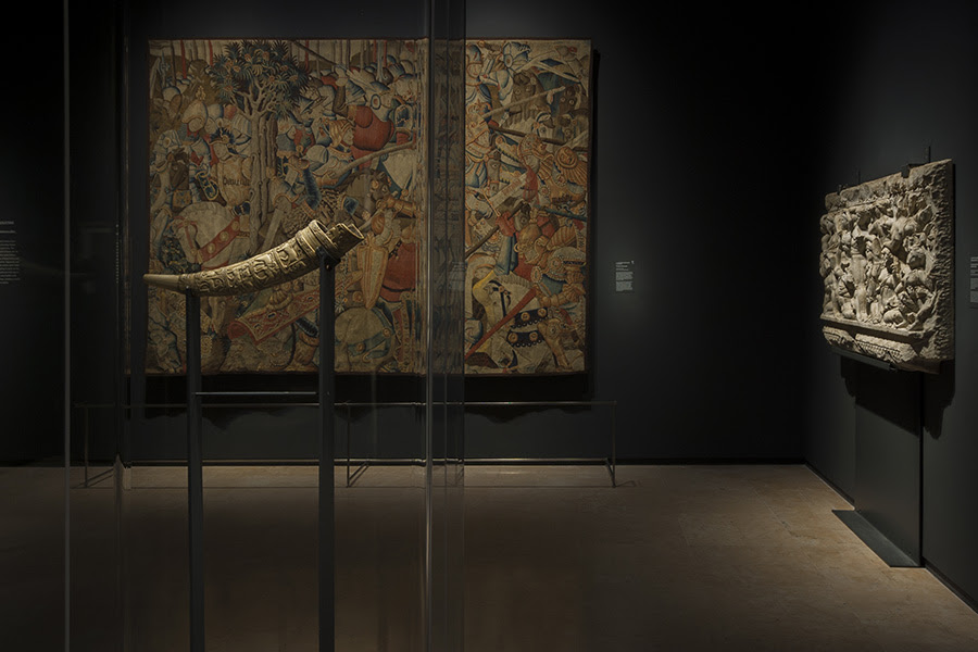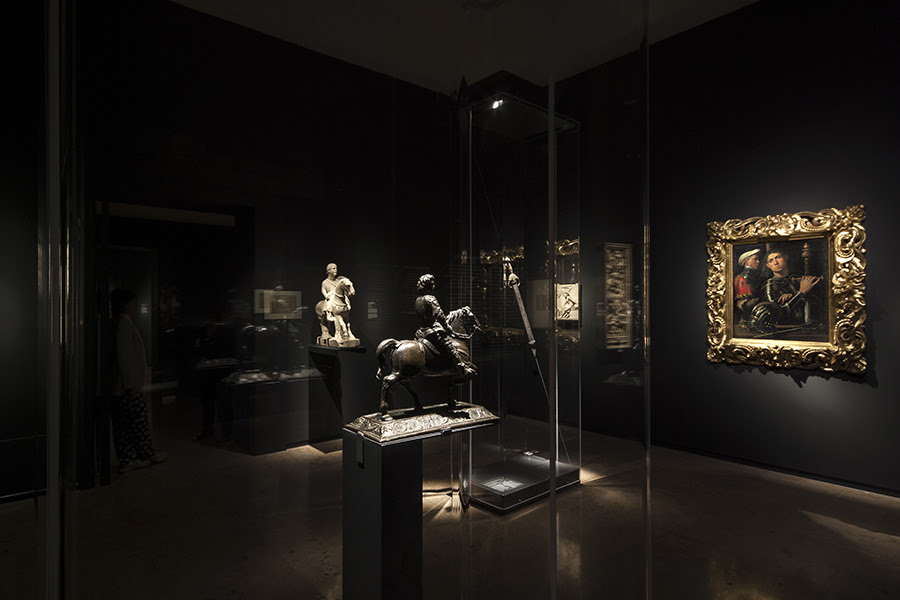 Da Mantegna a Leonardo, da Raffaello a Botticelli e Tiziano, i capolavori dei più grandi artisti del periodo insieme a sculture antiche e rinascimentali, incisioni, arazzi, armi, libri e manufatti di straordinaria bellezza e preziosità, faranno rivivere il fantastico mondo cavalleresco del Furioso e dei suoi paladini, offrendo anche un suggestivo spaccato della Ferrara in cui fu concepito il libro e raccontando sogni, desideri e fantasie di quella società delle corti italiane del Rinascimento di cui Ariosto fu cantore sensibilissimo. Grazie al sostegno dei maggiori musei del mondo, le opere conosciute o ammirate dal poeta, sono riunite a Ferrara per dare vita ad un appuntamento espositivo irripetibile: dall’olifante dell’XI secolo, che la leggenda vuole sia il corno che Orlando fece risuonare a Roncisvalle, alla straordinaria scena di battaglia di Leonardo da Vinci concessa in prestito dalla regina Elisabetta II; dalla preziosa terracotta invetriata dei Della Robbia raffigurante l’eroico condottiero Scipione dal Kunsthistorisches Museum di Vienna, al romantico, trasognato “Gattamelata” di Giorgione dagli Uffizi, celebre comandante di ventura ritratto nella sua luccicante armatura moderna; dal raffinato dipinto “La liberazione di Andromeda” di Piero di Cosimo sempre degli Uffizi, fonte dell’episodio di Ruggiero che salva Angelica dalle spire del drago, all’immaginifica e monumentale visione di “Minerva che scaccia i Vizi dal giardino delle Virtù” di Mantegna del Louvre, che Ariosto vide nel camerino d’Isabella d’Este, le cui figure fantastiche ricompaiono nel corteo di mostruose creature incontrato da Ruggiero nel regno di Alcina e il “Baccanale degli Andrii” di Tiziano, uno dei capolavori del Camerino delle pitture di Alfonso d’Este che, grazie ad un prestito eccezionale concesso dal Museo del Prado, torna in Italia dopo quasi cinquecento anni dalla sua creazione.