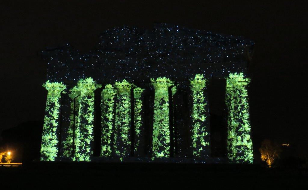 ARCHÈ è il nome del progetto, che ha ricevuto il Matronato della Fondazione Donnaregina per le arti contemporanee, che usa come tela-schermo la facciata Ovest del Tempio c.d. di Nettuno, tra i meglio conservati del Mediterraneo, e racconta il culto della dea Hera, dalla “capanna primordiale” come l’immaginavano architetti e artisti del Settecento fino al tempio classico.