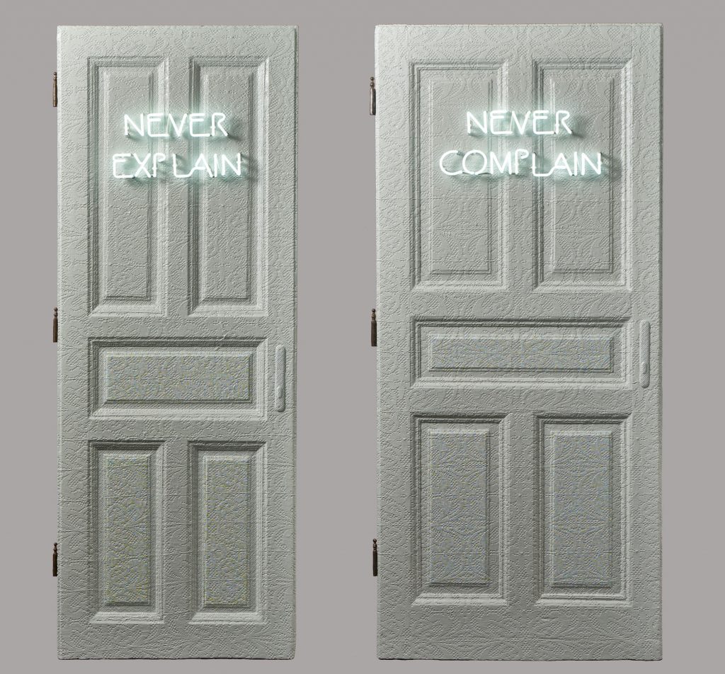 Ad accompagnare le tre figure, ci sono anche quattro porte decorate, una delle cifre più riconoscibili del lavoro di Havadtoy, dove per la prima volta appaiono le scritte “Only want your body; Only want your money; Never explain; Never complain”.