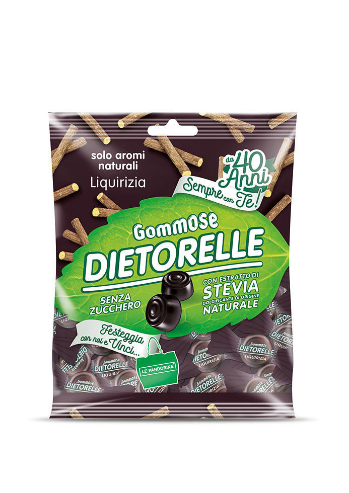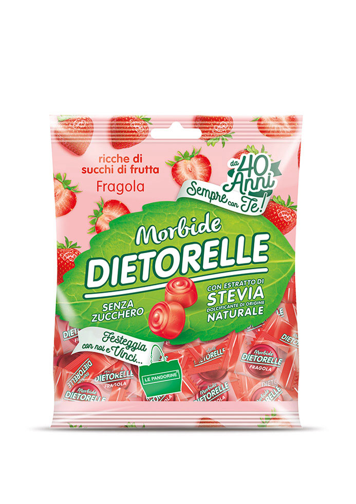 Tutti conosciamo le mitiche Dietorelle, da sempre ci accompagnano nella vita con la loro leggerezza unica, un piccolo tesoro da portare sempre con sé per concedersi degli attimi di dolcezza in ogni momento. Da oggi la tentazione diventa ancora più accessibile grazie alla ricetta completamente rinnovata: le Dietorelle sono sempre senza zucchero, ma dolcificate naturalmente grazie all’estratto di stevia, una pianta sudamericana dalle grandi doti dolcificanti: diventando così le sole caramelle ricche di frutta dolcificate con estratto di stevia, questo senza dimenticare che sono senza coloranti e senza aromi artificiali.
