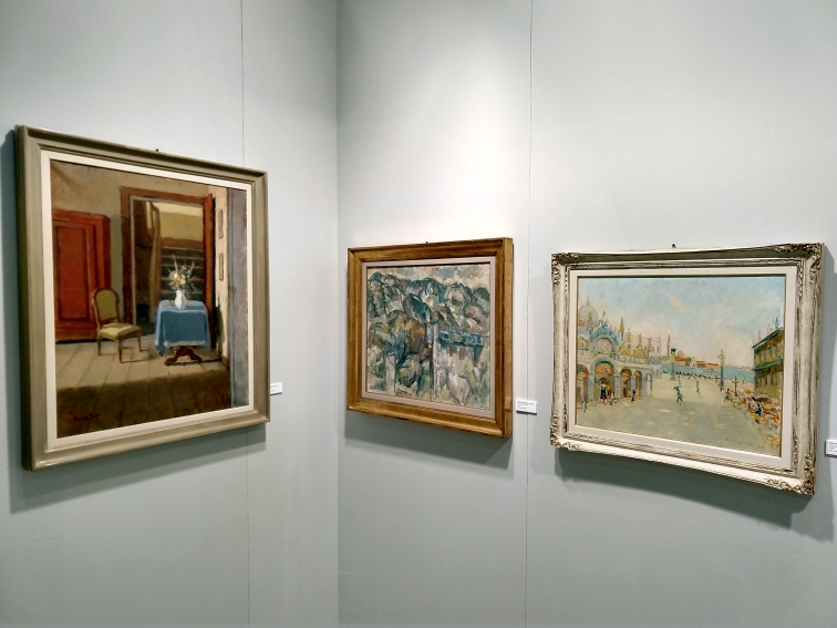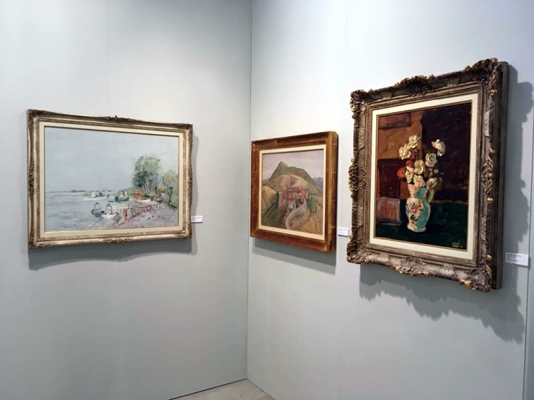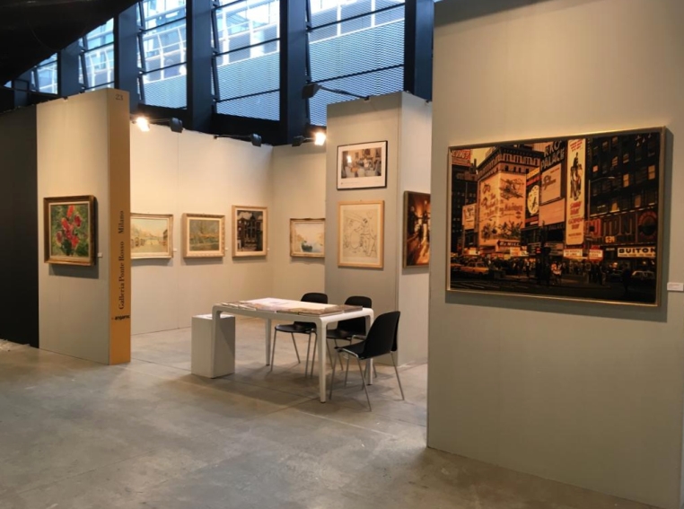L’altra metà dello stand di Ponte Rosso è, invece, dedicata alla storia della galleria: alcuni dei pittori che l’hanno resa importante, e punto di riferimento a Milano per la pittura figurativa dal 1973, sono presenti con un quadro ciascuno. Si tratta di pittori Chiaristi lombardi, che si opponevano alla corrente di Novecento, considerata arte ufficiale del regime fascista, o esponenti del Cenacolo di via Bagutta, che si riuniva nell’omonima trattoria, dove nacque anche il premio letterario, alcuni dei quali andavano spesso a Venezia e Burano, luogo di ritrovo di altri pittori figurativi veneti.