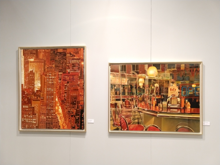 Da un lato lo spazio è interamente occupato dai dipinti di Paolo Paradiso: visioni di un sogno americano ormai passato, tra bagliori dorati di città al tramonto, come canyon di grattacieli, e luci notturne di insegne e fanali che scivolano su carrozzerie cromate. La ricerca di Paradiso si concentra, infatti, sulla rappresentazione del periodo d’oro di Broadway e Hollywood, dell’America uscita vincitrice dalla guerra, tra anni ’40-’50, di cui colleziona cimeli e fonti di ispirazione come fotografie, locandine, poster e riviste.