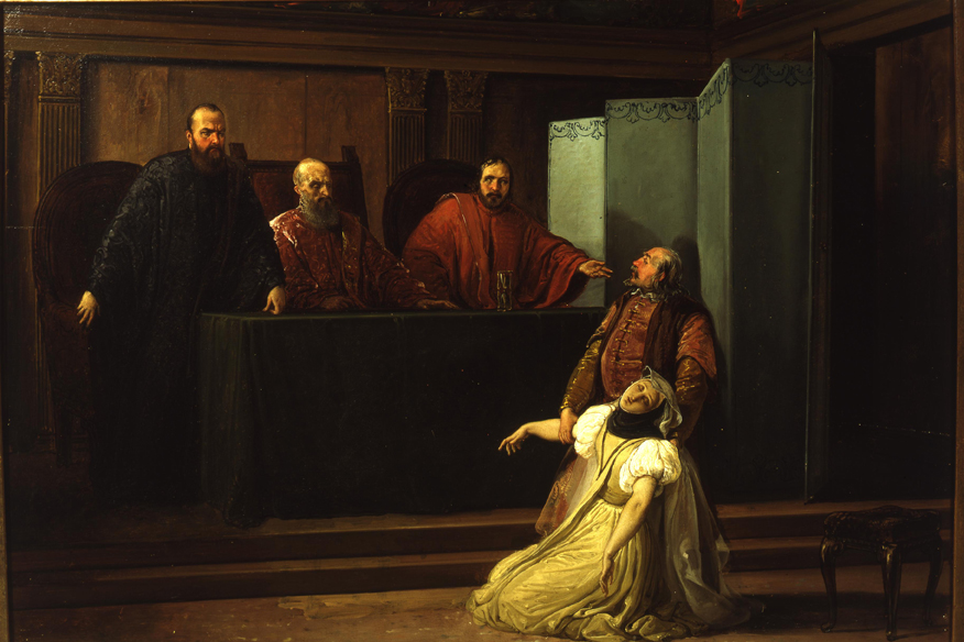 Il soggetto – Valenza Gradenigo, colpevole di aver tentato di salvare l’amato Antonio Foscarini, condannato per tradimento nel 1662, viene condotta davanti ai giudici dell’Inquisizione, tra cui il padre – è emblematico dello spostamento della pittura di Hayez su un binario romanzesco e sentimentale, che in questi anni contribuisce alla costruzione del mito di una Venezia torbida e misteriosa, salutato da grande successo.