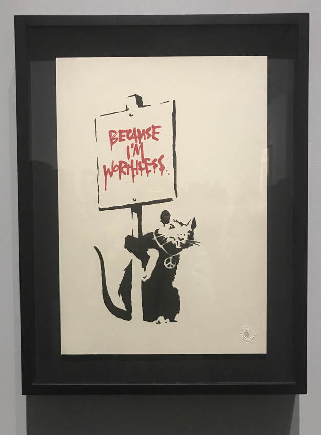 Infatti, quando si supera l’aspetto del “personaggio” Banksy e si approfondisce l’artista si scopre un mondo immenso e, attraverso questa mostra, lo spettatore riesce a comprendere l’essenza di Banksy: cosa significa il suo lavoro e perché ha colpito al cuore un pubblico assolutamente trasversale.