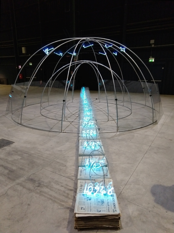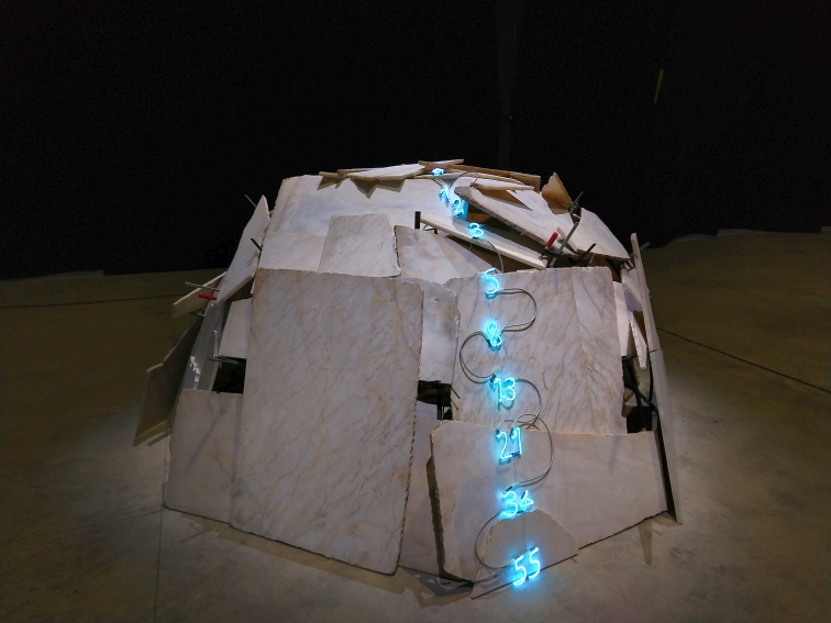 Lo spazio della mostra, liberamente percorribile a livello del pavimento, è scandito ritmicamente solamente in alto da una sequenza di Fibonacci realizzata in neon rosso nel 2002. Fotografabili a fatica, i numeri rossi brillano nel buio alla sommità delle “Navate” dell’Hangar, sovrastando gli Igloo, quasi come il fregio di un tempio antico o i lumi delle cappelle di una cattedrale, dando un aspetto quasi sacro allo spazio architettonico ex-industriale e integrandolo con le opere sottostanti.