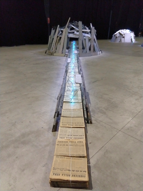 Il percorso di Mario Merz. Igloos è disposto per nuclei cronologici, dal 1968 al 2003, anno della scomparsa dell’artista. La direzione non è, però obbligata: la sensazione è, anzi, quella di poter attraversare a piedi le rovine di una città irreale o i resti di un insolito accampamento, potersi perdere in un paesaggio assolutamente inedito, punteggiato dalle calotte degli igloo, piccoli e grandi.