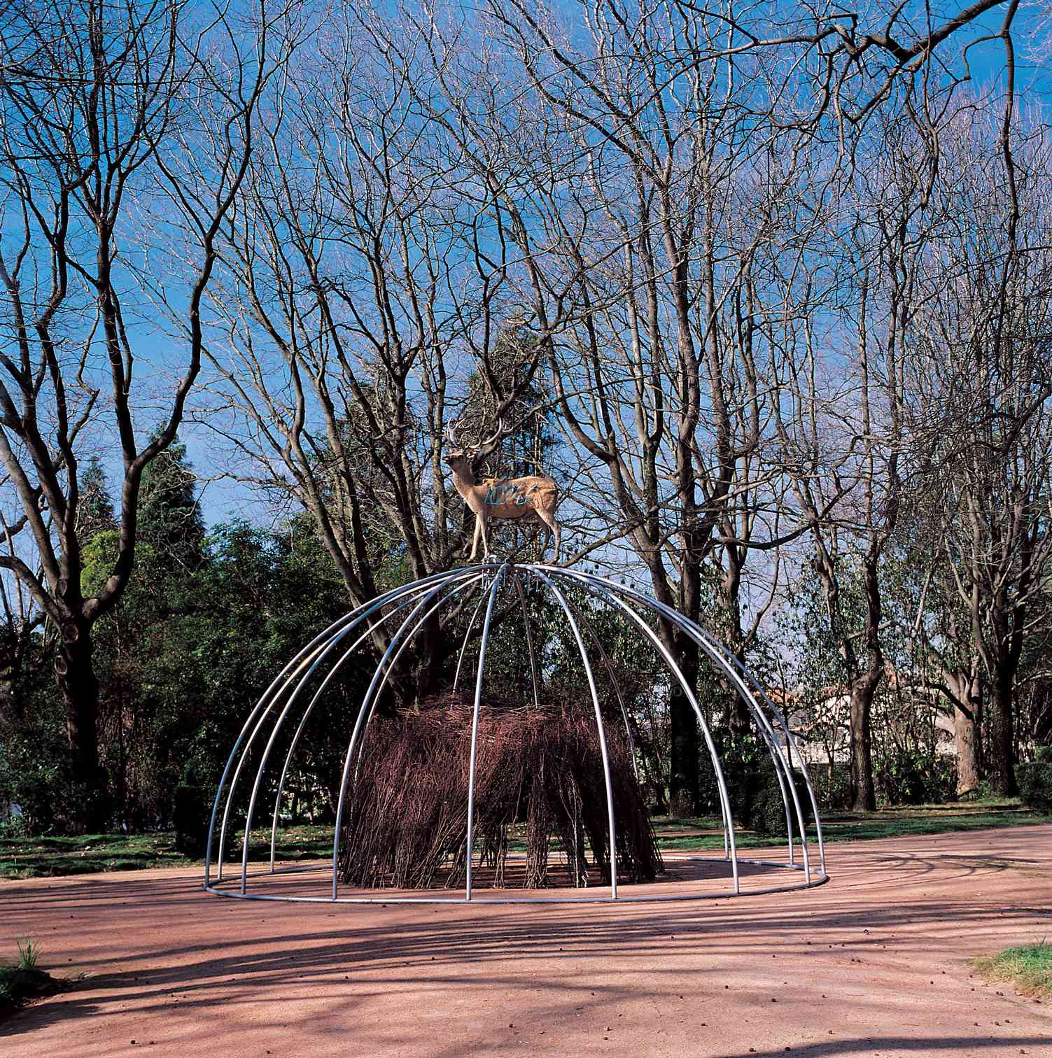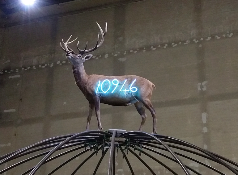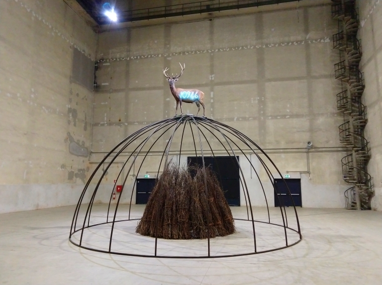 L’ultimo ambiente di HangarBicocca, l’immenso “Cubo”, è occupato dal suggestivo Senza titolo (1999): un cervo impagliato domina i visitatori dalla cima della cupola, come incoronato da un numero di Fibonacci al neon. L’opera, che contiene rimandi alla natura, venne realizzata per il parco della Fundação de Serralves di Porto in occasione di una personale di Merz curata proprio da Vicente Todolì, allora direttore dell’istituzione portoghese.