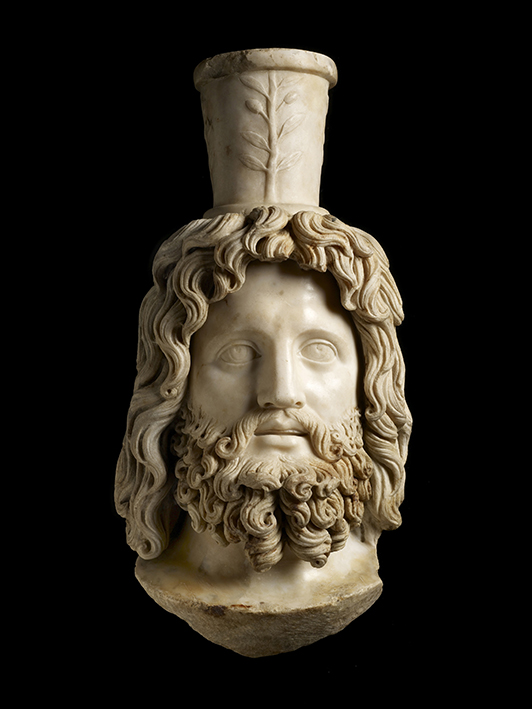 Marble oscillum (circular relief) showing a satyr pouring wine into a calyx krater (vessel for mixing wine and water) 50 BC–AD 50 Findspot unknown Diameter 35.9 cm Private collection