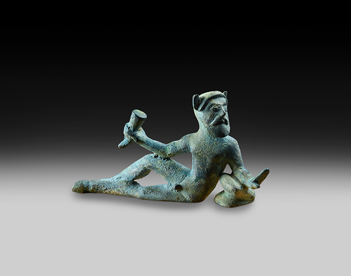 Bronze reclining satyr from the rim of a vessel 500–400 BC Possibly from Chiusi, Tuscany 4.5 x 6.8 cm Ashmolean Museum, University of Oxford