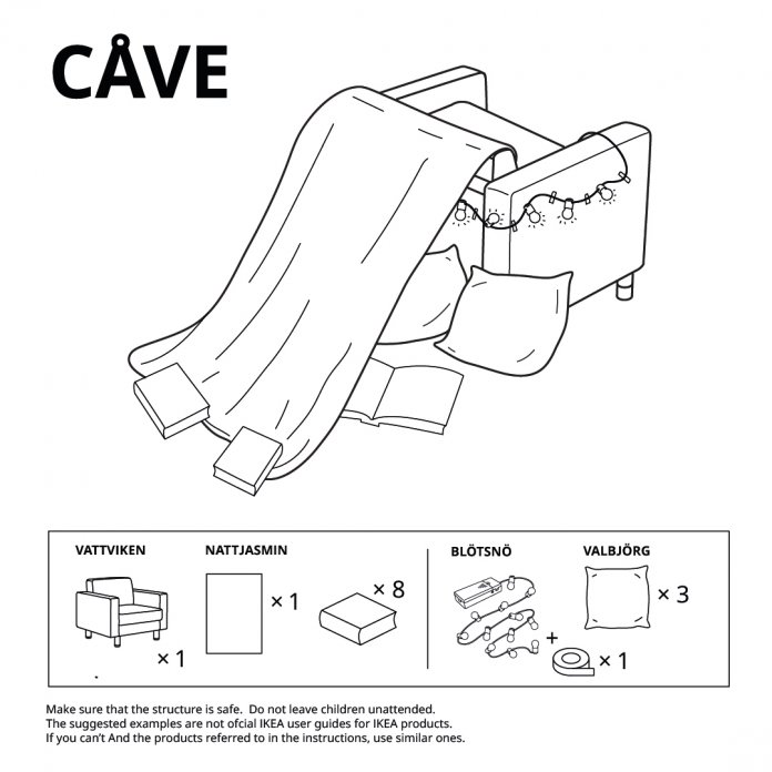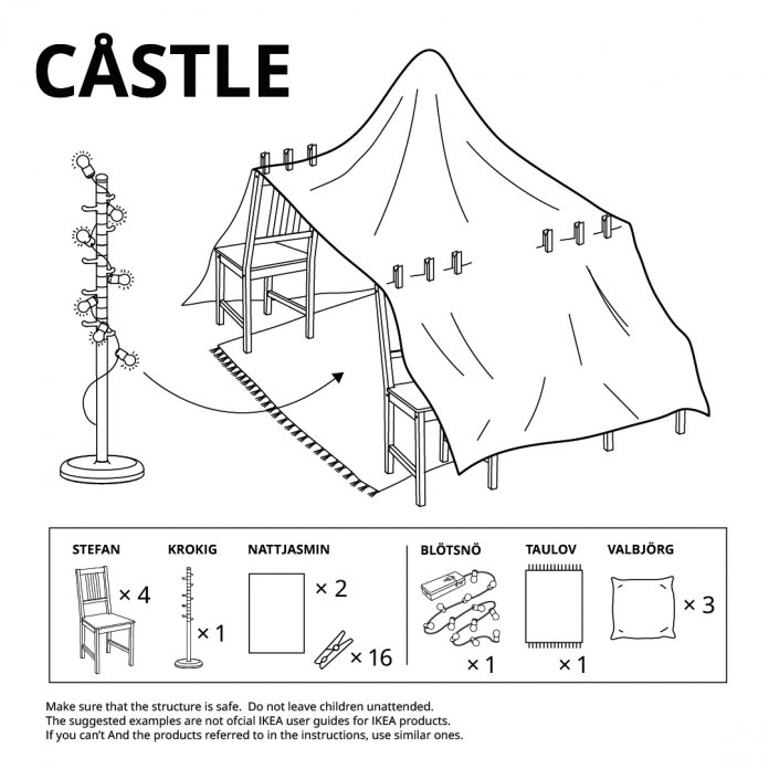 La dettagliata guida è composta da sei diverse varianti, ognuna comprende l’elenco completo di attrezzature necessarie alla costruzione e il nome di ogni oggetto necessario. Ovviamente Ikea ha usato oggetti venduti nei suoi negozi per specificare esattamente come costruirlo, ma non è necessario avere quel prodotto preciso perché le illustrazioni spiegano chiaramente come costriore i fortini con gli oggetti che si hanno in casa.