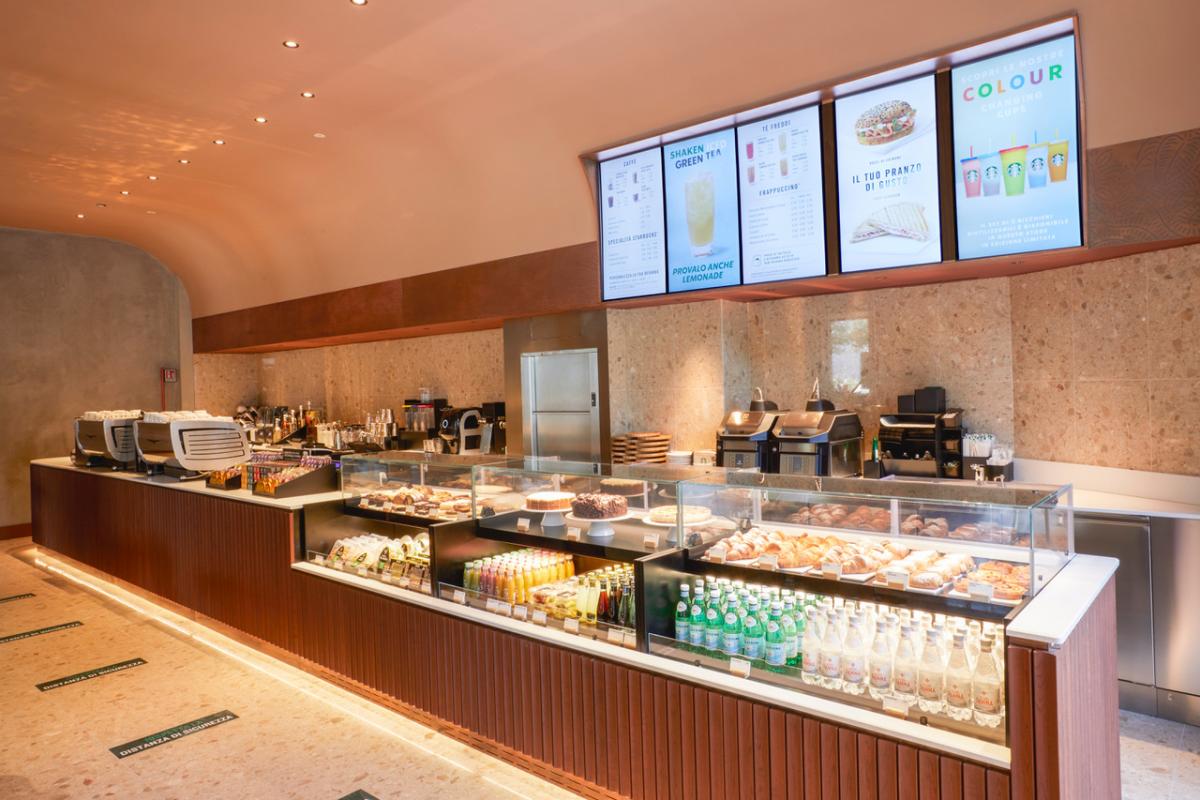 Gli spazi mantengono la stessa atmosfera che ormai ci fa sentire a casa, un luogo accogliente e piacevole in stile contemporaneo, dove gustarsi un caffè in compagnia o trascorrere del tempo da soli, per svago o per lavoro, perché ricordiamolo, da Starbucks c’è sempre la connessione wi-fi gratuita, il tutto accompagnato da unampia scelta di bevande a base di caffè sostenibili di alta qualità e tè, oltre da un’elevata offerta gastronomica adatta a qualsiasi momento della giornata.