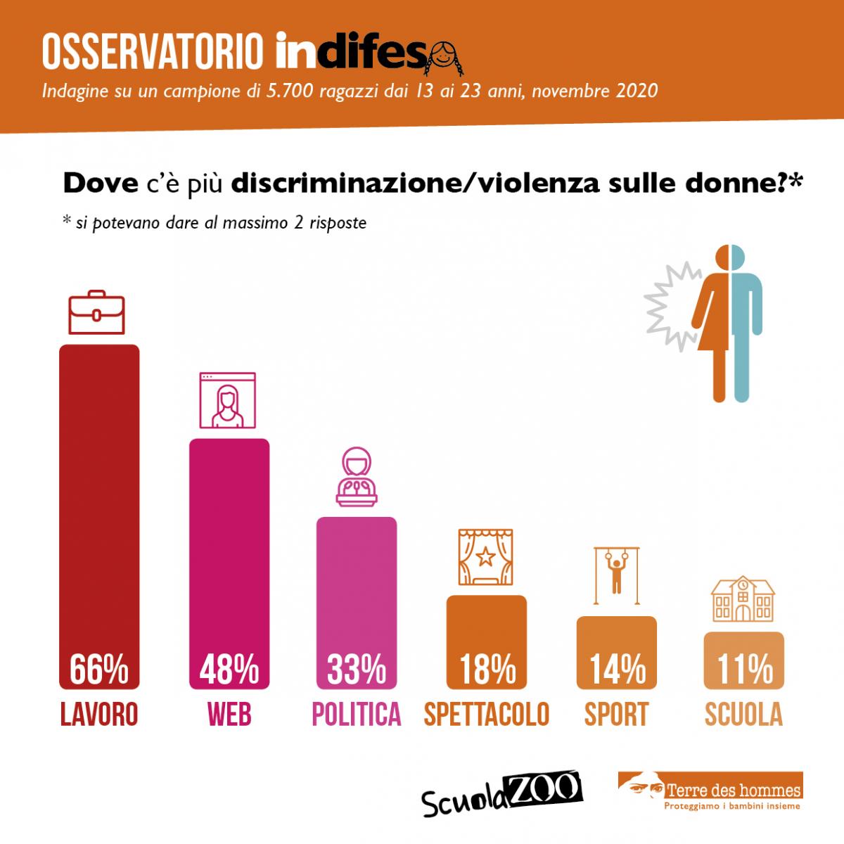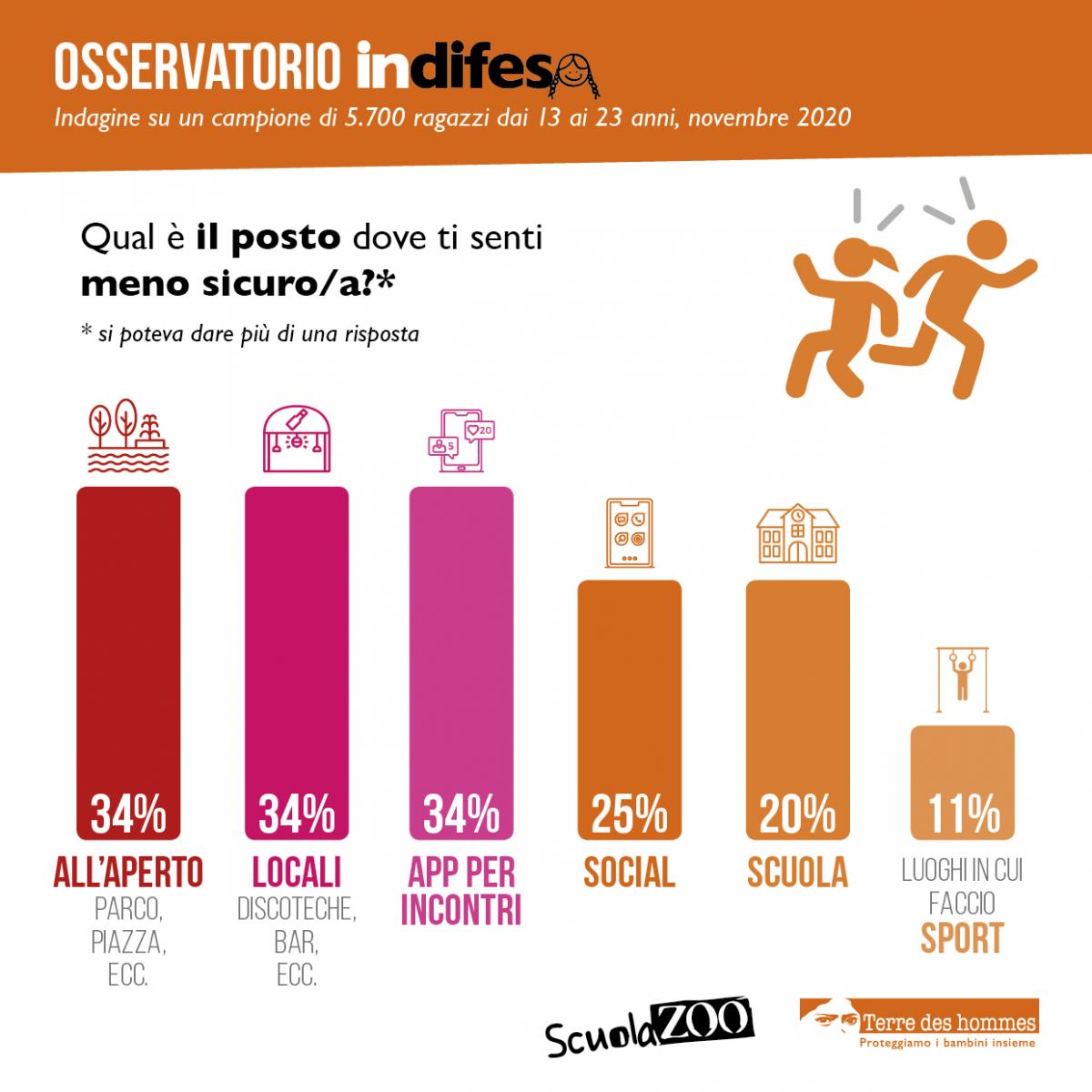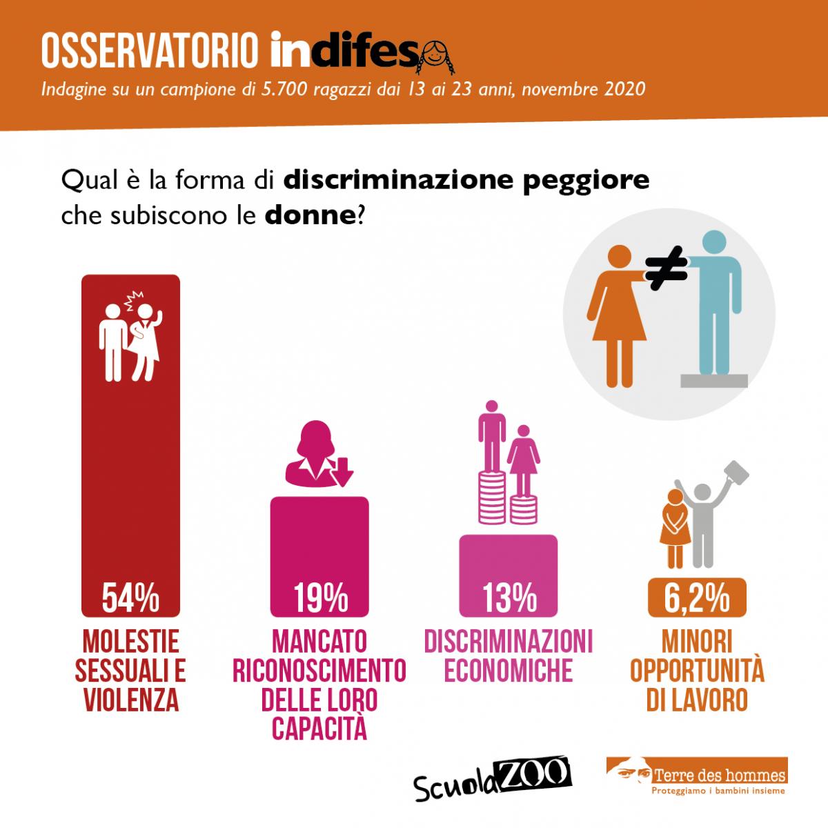 Violenza sulle donne: 9 ragazze su 10 non si sentono al sicuro, in occasione della Giornata internazionale per l’eliminazione della violenza contro le donne che cade il 25 novembre, l’Osservatorio indifesa di Terre des Hommes e ScuolaZoo rende noti i dati dell’ultima ricerca, condotta su 5.700 adolescenti e giovani di età compresa tra i 13 e i 23 anni. Ragazze e ragazzi hanno le idee chiare: la violenza non è solo stupro, ma anche pressioni psicologiche, discriminazioni nei luoghi di studio e di lavoro, commenti sessisti sui social, bullismo e cyberbullismo, revenge porn. Inoltre la scuola non è sentita come luogo sicuro o in cui trovare conforto, ma è qui che 5 ragazzi su 10 dedicherebbero almeno un’ora a settimana per impegnarsi in prima persona nella lotta alla violenza di genere e di orientamento sessuale.