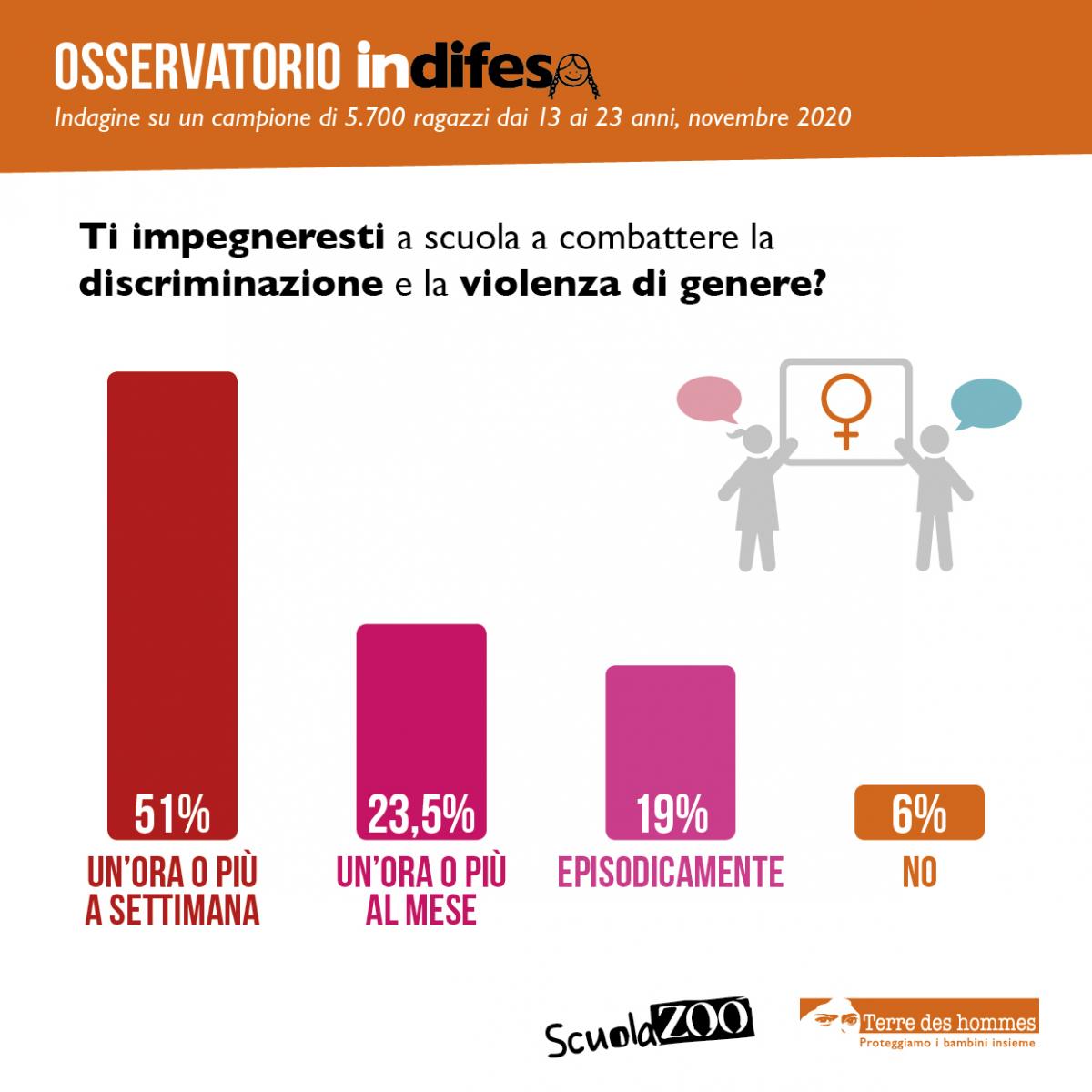 La scuola non è dunque percepita come baluardo dinanzi a un pericolo, anzi addirittura il 20% del campione lo ritiene il luogo in cui si sente meno sicuro. Per contro, passando dalle percezioni alle esperienze concrete, il 70% delle ragazze dichiara di non essersi mai sentita discriminata in classe, da compagni o insegnanti, perché femmina. Anzi, la scuola diventa luogo in cui impegnarsi per combattere contro pregiudizi e violenze di genere: il 51% degli intervistati dedicherebbe 1 o più ore a settimana per impegnarsi in prima persona a scuola nella lotta alla violenza di genere e di orientamento sessuale, mentre il 23% dedicherebbe 1 o più ore al mese.