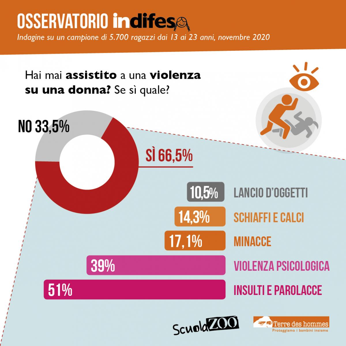 Rispetto alla violenza assistita, più della metà degli intervistati (51%) è stato spettatore di forme di violenza verbale, il 39% a forme di violenza psicologica, 1 su 4 ha visto con i suoi occhi episodi di violenza fisica come schiaffi e calci (14%) e lancio di oggetti (10,5%). C’è anche un 33% che dice di non essersi mai trovato di fronte a violenze contro le donne.