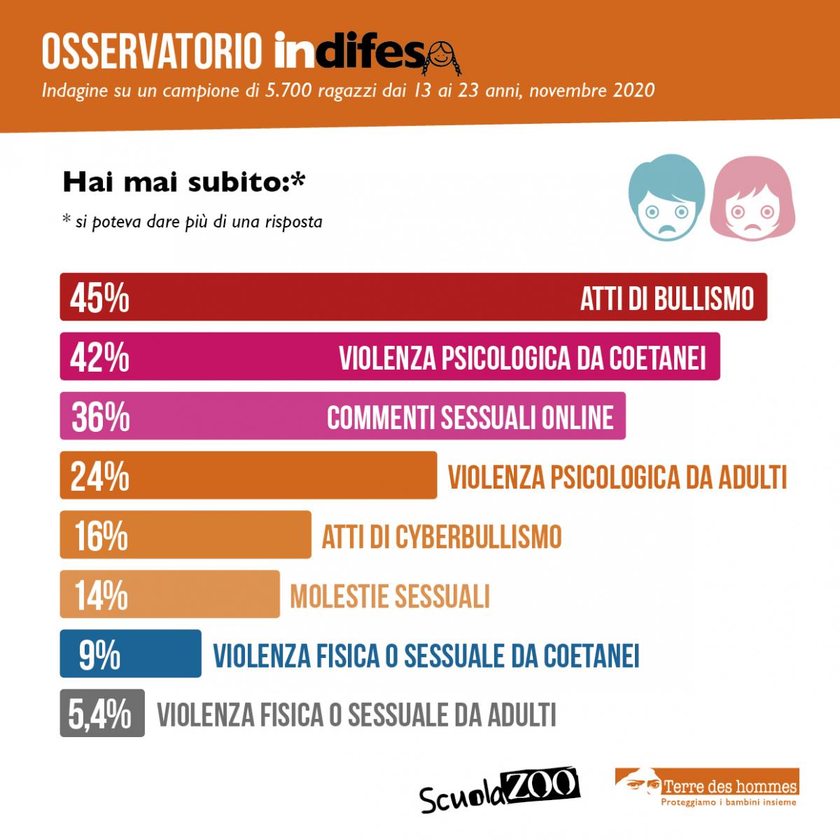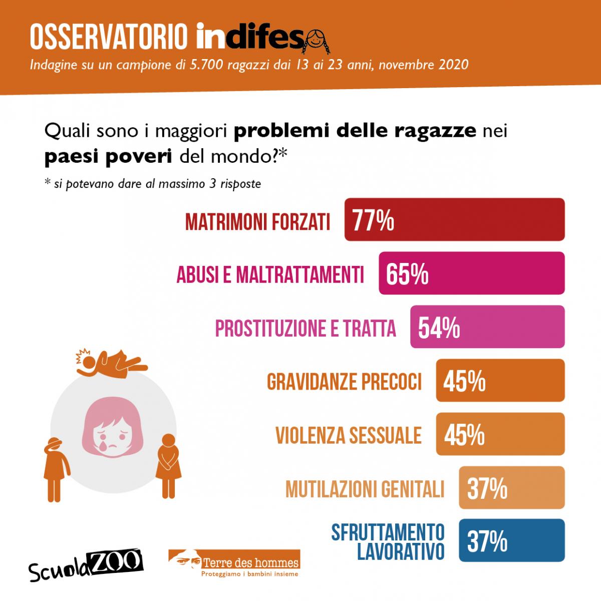 Parlando poi di violenza subita dai ragazzi almeno una volta nella vita, emergono al primo posto gli atti di bullismo (45%) che se sommati a quelli di cyberbullismo (16%) interessano oltre 6 ragazzi su 10. Seguono la violenza psicologica da parte di coetanei (42%), commenti a sfondo sessuale da parte di estranei online (36%), violenza psicologica da parte di adulti (24%). Nei ragazzi forte è anche la consapevolezza della globalità del problema. Guardando fuori dall’Italia, ai paesi più poveri del mondo, il 77% dei giovani vede nei matrimoni forzati una delle più penose piaghe subite dalle ragazze, seguito da abusi e maltrattamenti (65%), prostituzione e tratta (54%), gravidanze precoci e violenze sessuali (entrambe al 45%), mutilazioni genitali e sfruttamento lavorativo (entrambi al 37%).