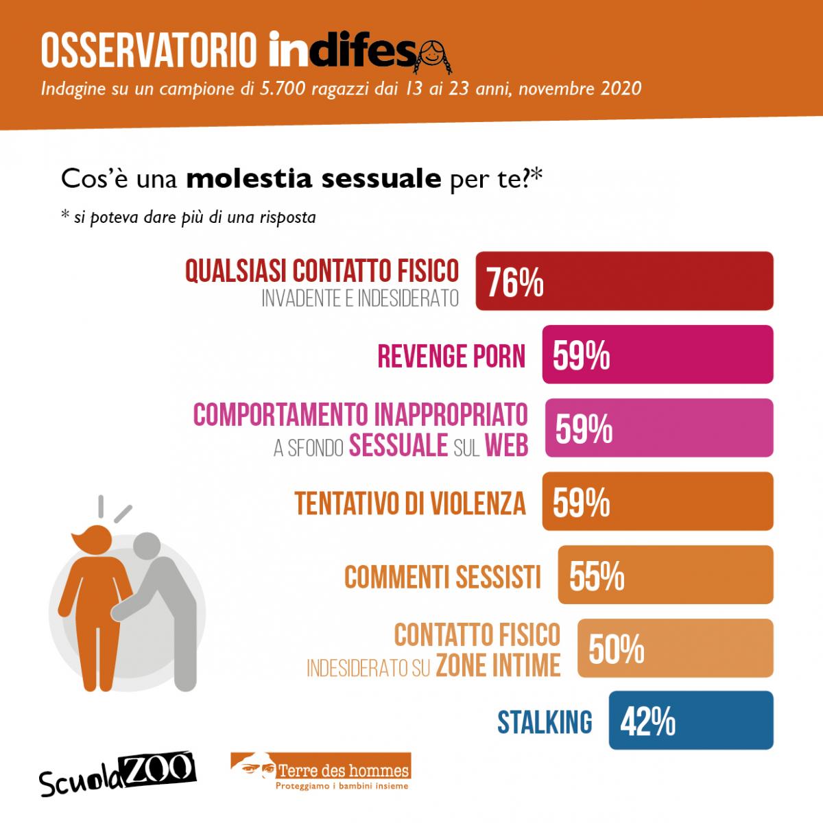 Il 54% degli studenti che hanno partecipato al questionario ritiene che le molestie sessuali siano la forma di discriminazione peggiore che subiscono le donne, ma a questo dato si associa quello sulla discriminazione economica, che viene riconosciuto dal 13% degli intervistati, e sul mancato riconoscimento delle proprie capacità, segnalato dal 19%. Il posto di lavoro è il primo tra i luoghi in cui c’è più violenza/discriminazione contro le ragazze/donne: lo pensa il 66% dei ragazzi. Il 48% sente come luogo di discriminazione il web, e il 33% indica gli ambienti della politica. Quanto alle minacce maggiori per un/a ragazzo/a, il 34% ritiene che sia la violenza sessuale, seguita con un distacco di 5 punti percentuali dalle droghe (30%) e da bullismo e cyberbullismo che insieme ottengono il 28% delle risposte. Ma cos’è una molestia sessuale? Per il 76% lo è qualsiasi contatto fisico indesiderato; il 59% indica il fenomeno del revenge porn e la stessa percentuale parla dei comportamenti “inappropriati” a sfondo sessuale su web e social, e del tentativo di violenza fisica. 4 punti in meno, con il 55% delle risposte, emerge anche il tema dei commenti sessisti e delle insinuazioni a sfondo sessuale.