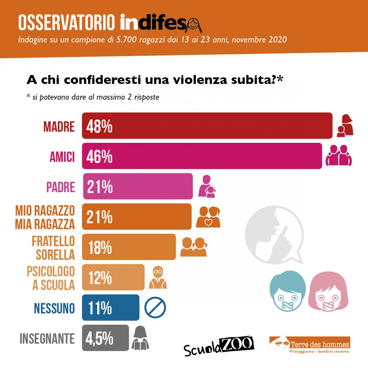 La mamma rimane la persona di cui i ragazzi si fidano di più: il 36% la considera il punto di riferimento in caso di difficoltà. Solo 1 su 4 indica gli amici e 1 su 10 il fratello o la sorella. Ancora più giù troviamo il partner (9%) e poi il papà (6%). La figura dell’insegnante non raggiunge l’1% delle risposte (0,7%). Il 48% confiderebbe alla mamma una violenza subita, seguita immediatamente dagli amici (46%); ben distanziati troviamo il partner e il papà (entrambi al 21%) e il fratello/sorella (18%). Significativo che più di 1 su 10 (11%) dichiari che non si confiderebbe con nessuno.