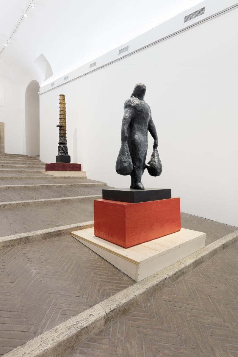 Lungo la scalinata, si affaccia un gruppo di enigmatici bronzi a sollevare la questione della coscienza morale in una società coinvolta in un continuo movimento, in profonda mutazione. La scultura monumentale “The Herring” domina l’ultima sezione con i suoi 5 metri di altezza. Una nuova scultura, realizzata in collaborazione con gli storici laboratori della Porzellanmanufaktur Augarten, rivisita una porcellana di Doccia ed è presentata al pubblico per la prima volta. Diffusa in tutto lo spazio, una nuova serie di “Bolders” in gres smaltato invita il pubblico a sedersi, prendere tempo, osservare le opere per scoprirne le connessioni e immergersi in magnifici dettagli: superfici di vetro scintillanti, significati nascosti e metafore.