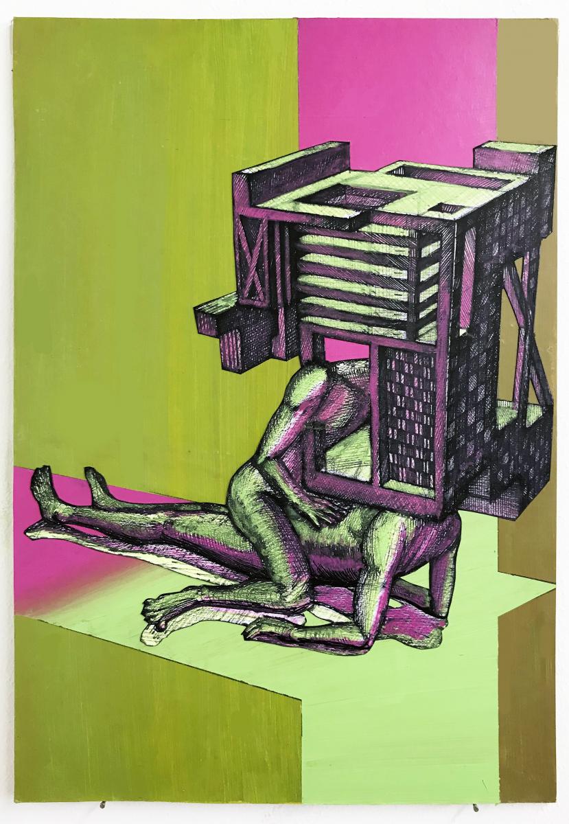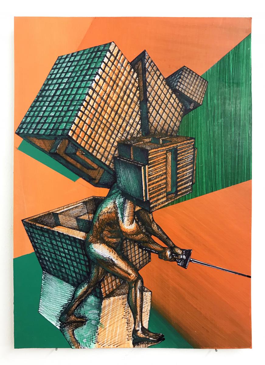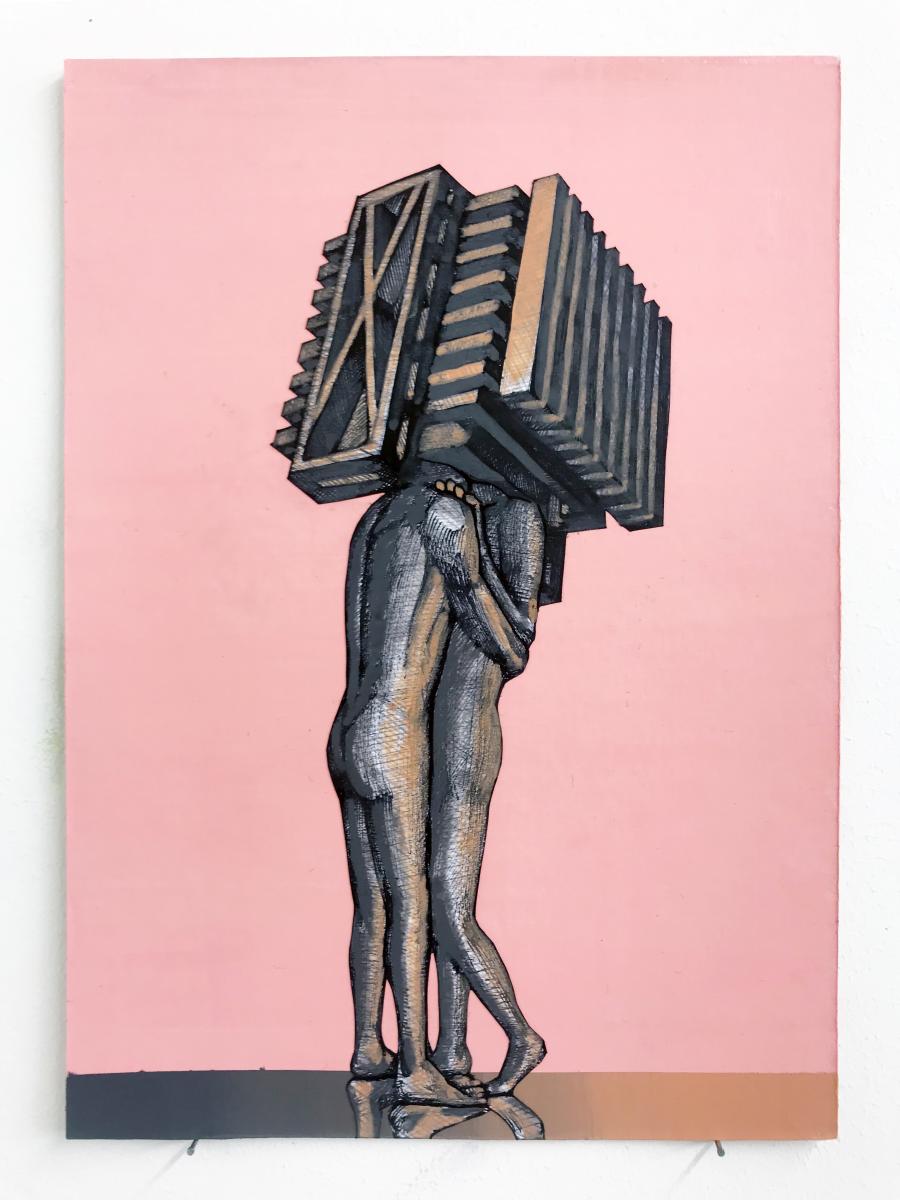 Commenta Min: “Durante i giorni della pandemia ho lavorato sul mio stato d’animo ansioso e inquieto. Il risultato sono uomini soli e isolati, che cercano di fare le cose consuete come camminare, abbracciarsi, lavorare, ma in realtà si sono trasformati essi stessi in edifici. Una trasformazione che pesa come un macigno sulle loro azioni quotidiane. Un tema, quello dell’individuo che si isola e viene isolato, tipico della produzione di Joonhong Min anche se solitamente questo avviene a causa della feroce competizione nella società contemporanea”. Continua l’artista, “L’atto di disegnare continuamente è il modo con cui sospendo temporaneamente l’ansia. Raccogliendo anche in strada quello che non è stato utilizzato, abbraccio ciò che è rimasto indietro in questa competizione moderna, sia che si tratti di oggetti, sentimenti o individui”.