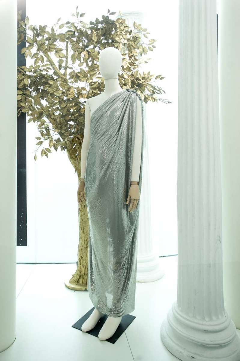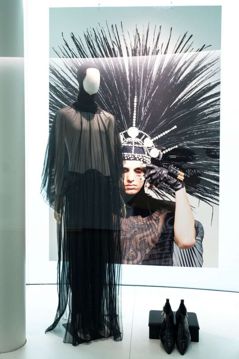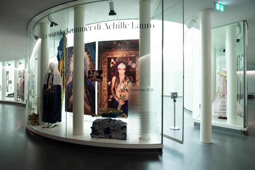 Percorrendo le vetrine incontriamo gli abiti di scena che Gucci ha realizzato per il cantante, in particolare per le esibizioni al Festival di San Remo degli ultimi due anni. Oltre alle creazioni finali, in ogni vetrina vediamo foto, esempi e fonti iconografiche che hanno ispirato l’artista e la maison nella creazione degli abiti.
