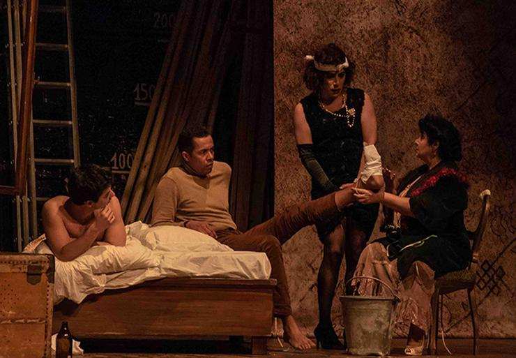 Sul palco salgono quattro figure che riempiono la scena senza lasciare nemmeno un momento sospeso, siamo subito catapultati a Napoli, è l’ultimo dell’anno e Donna Violante, interpretata da Marisa Laurito, ex serva in un bordello è ora la proprietaria di un appartamentino che vede il passaggio di persone in cerca di momenti di perduta follia.